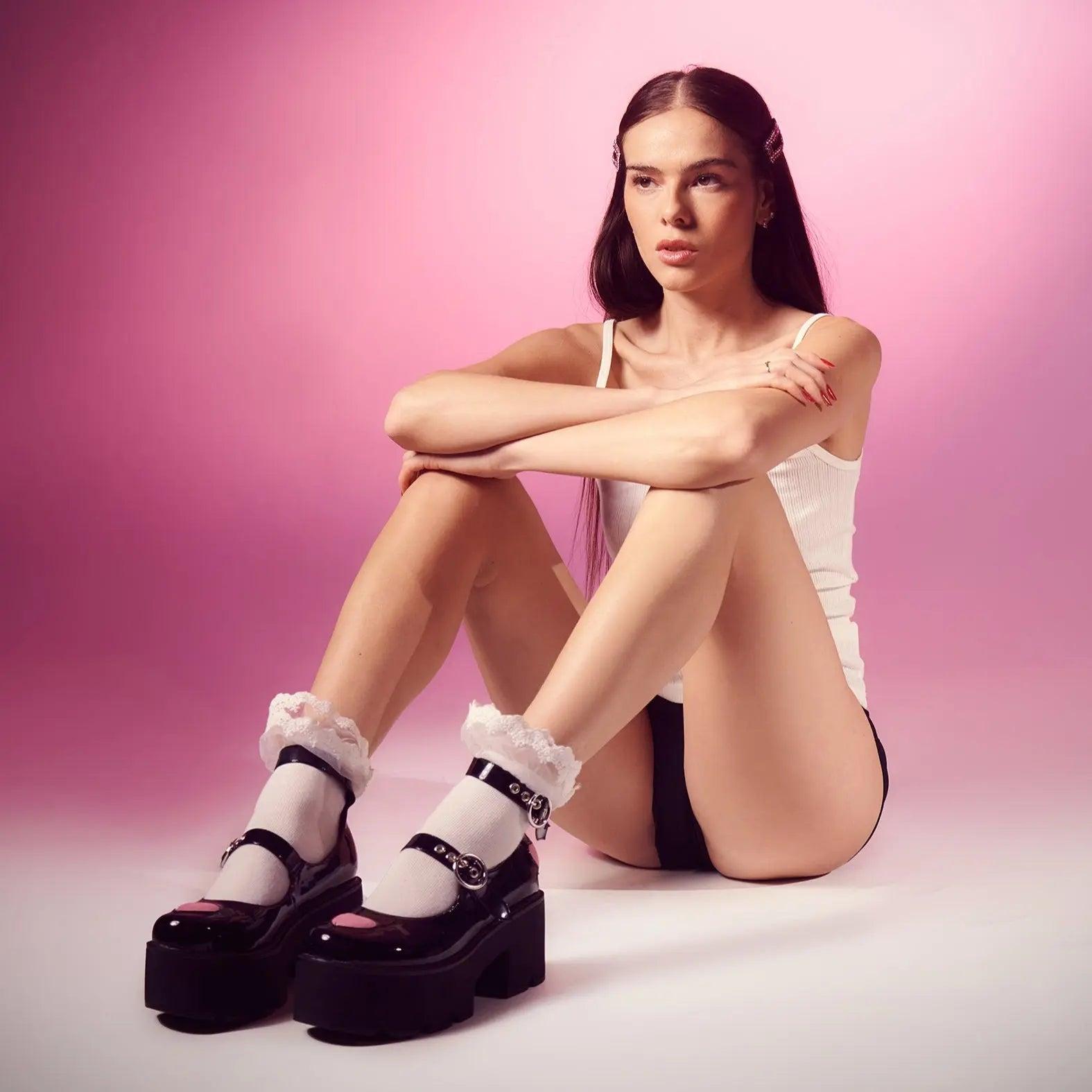 THE ICONRosey Love Chunky Mary Jane Shoes in Black patent. These Mary Janes feature a Pink faux suede hearts on a Chunky and comfortable Platform sole. Everyone needs a pairs of Mary Janes! Made with eco-friendly materials and 100% cruelty-free, these Mary Janes are as ethical as they are cute!- Platform Height: 3 inch- T Bar structure- Pink Hearts- O shaped buckles and silver eyelets- Chunky Platform sole- Round toe - 100% vegan SKU: LMS 449 - BlackPAT/Pink