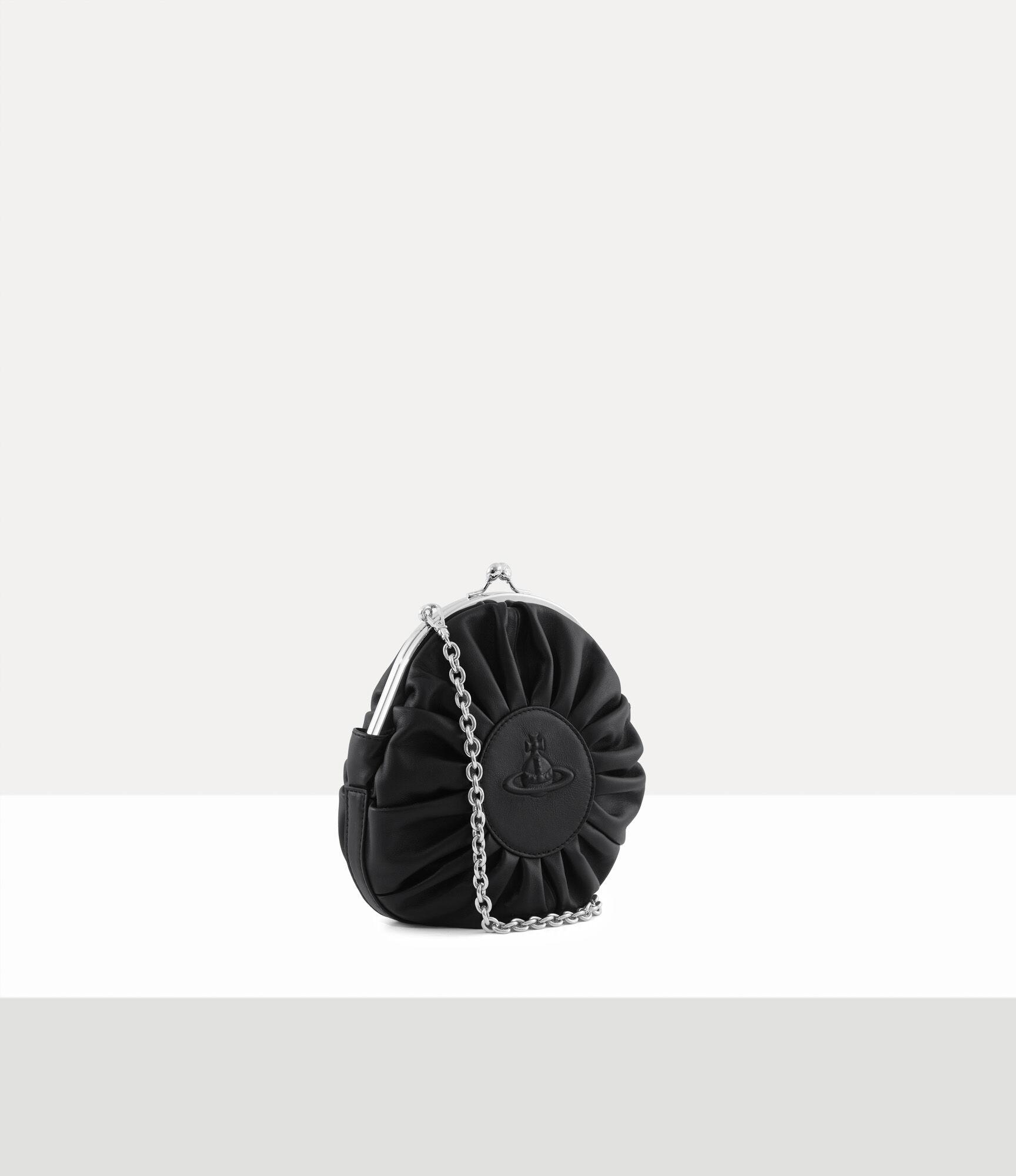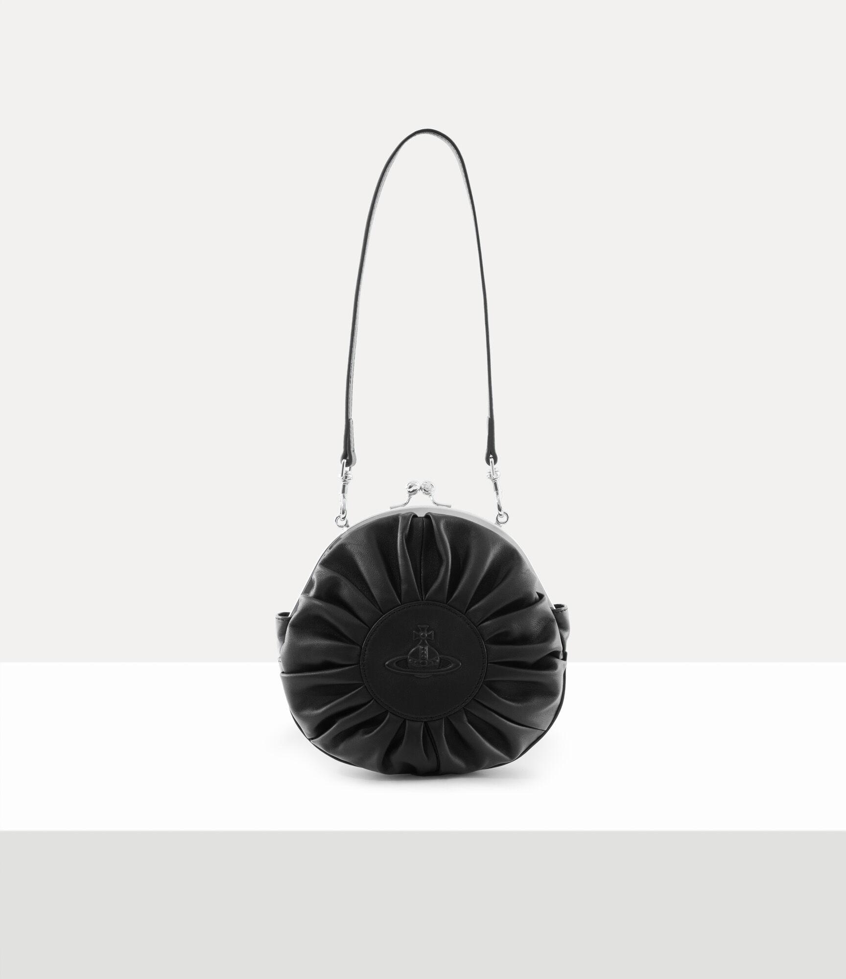 The Rosie Circle Frame Crossbody bag features a soft, rounded silhouette with elegantly pleated leather details surrounding the centre circle, creating a plush, cushion-like effect. Finished with an injected, three-dimensional orb motif, the piece embodies Vivienne's vision of launching tradition into the future.