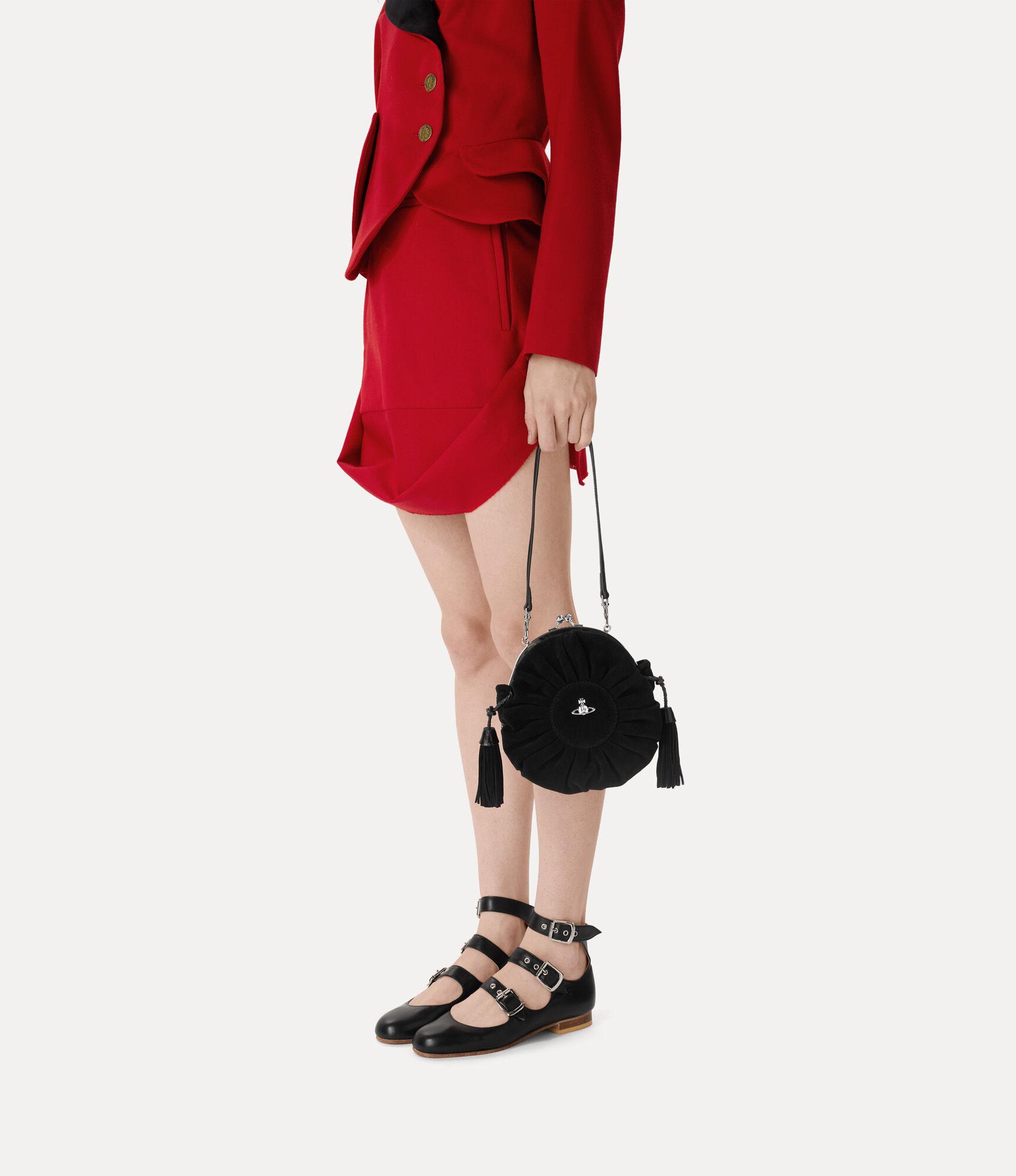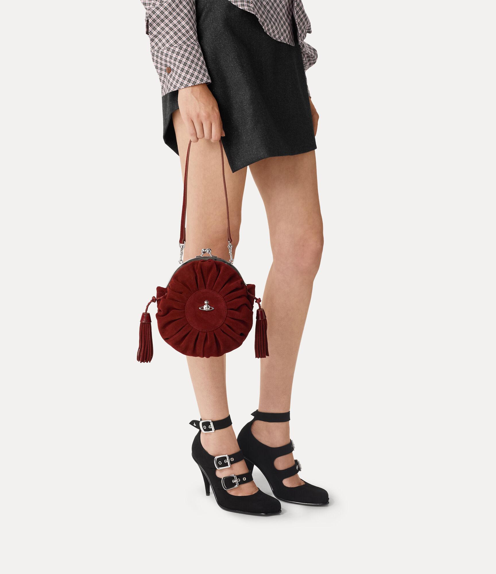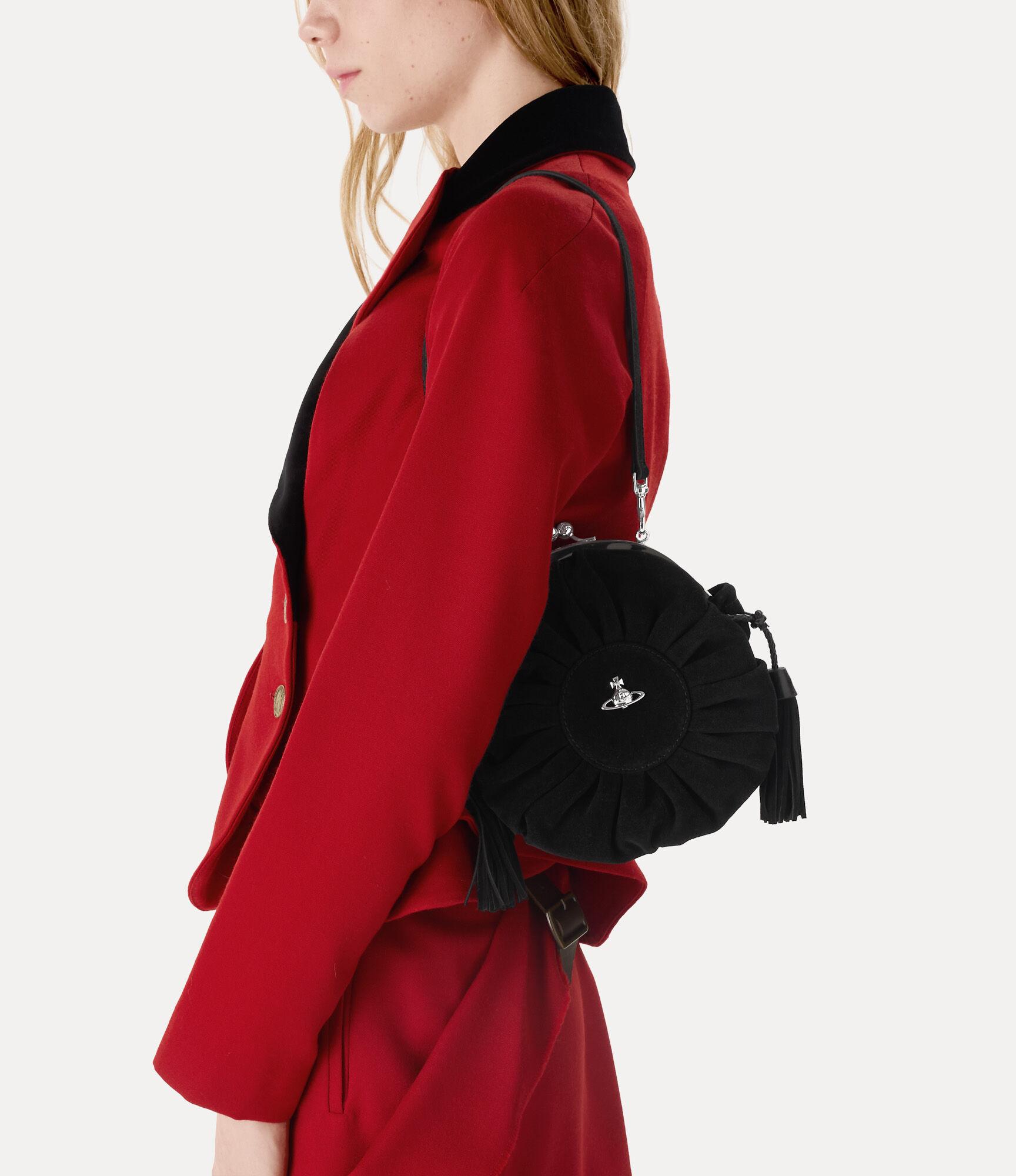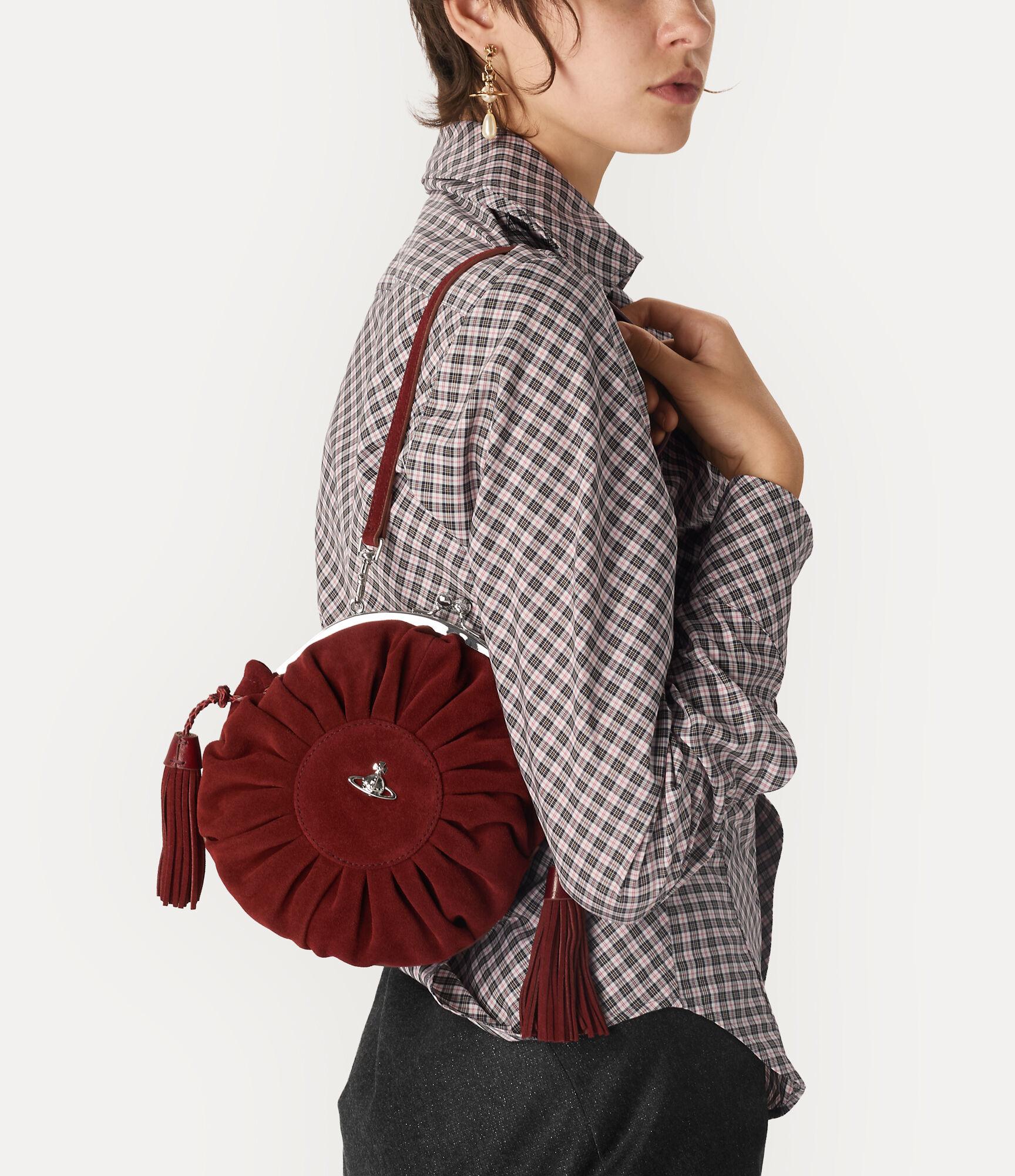 The Rosie Frame bag is reimagined in supple suede leather, featuring a soft, rounded silhouette accented by elegant pleating - evoking a plush, cushion-like effect. The design is lined with our distinctive 'Broken Pinstripe' motif - a unique reinterpretation of the classic pinstripe, first introduced in the Vivienne Westwood Gold Label Autumn-Winter 2015 collection.