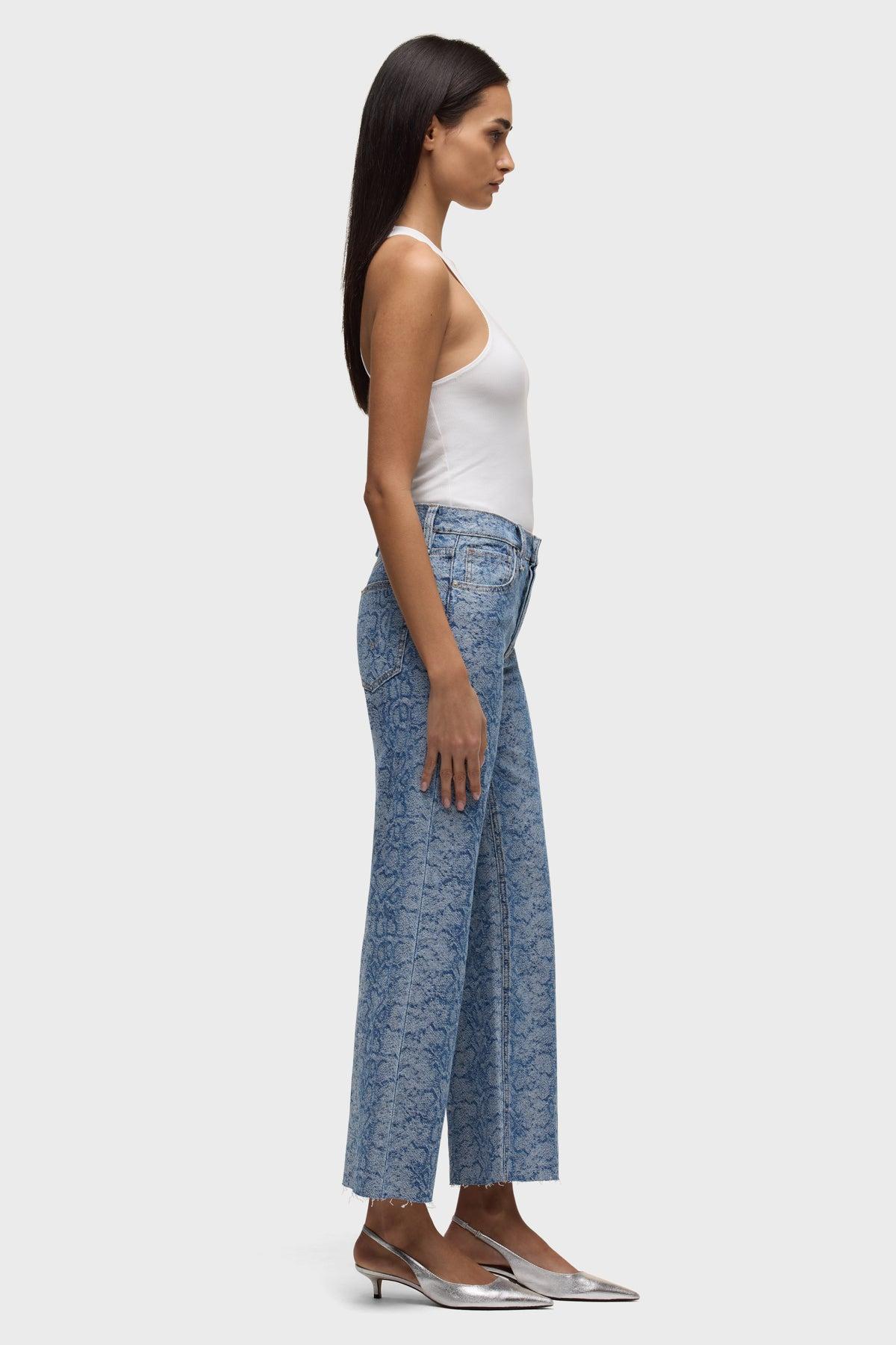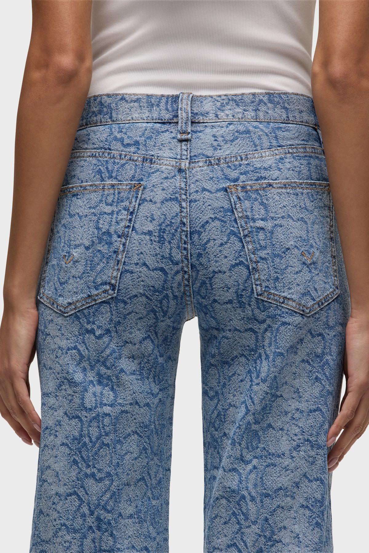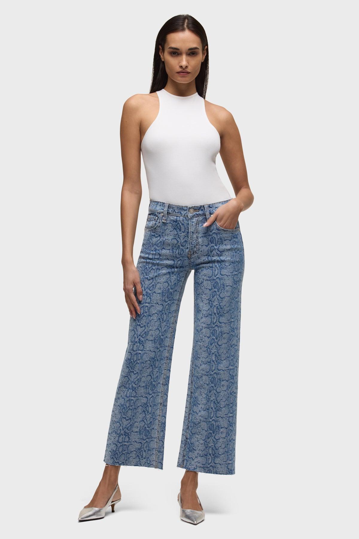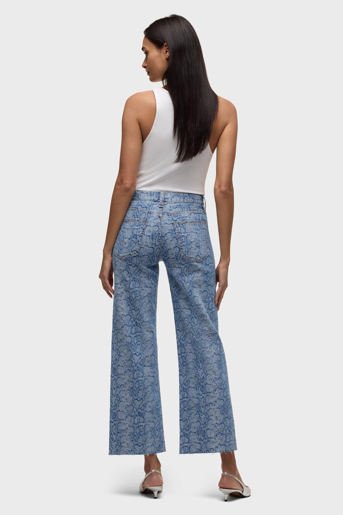 Description Our Rosie High-Rise Wide Leg Ankle Jean in Venom is cut with an elevated waistline and a roomy leg. The star of this style is the snake jacquard in a medium indigo wash on slightly stretchy denim. The jeans are finished with an ankle-length 28" inseam, raw hem and covered button fly. Product Details Front Rise: 10.25", Leg Opening: 20", Inseam: 29"Model Height 5'9"Model wearing size 25/SMeasurements based on size 27/S Fabric & Care Content: 99% Cotton, 1% ElastaneMachine wash cold gentle cycleOnly non-chlorine bleach when neededTumble dry lowMedium iron if needed"