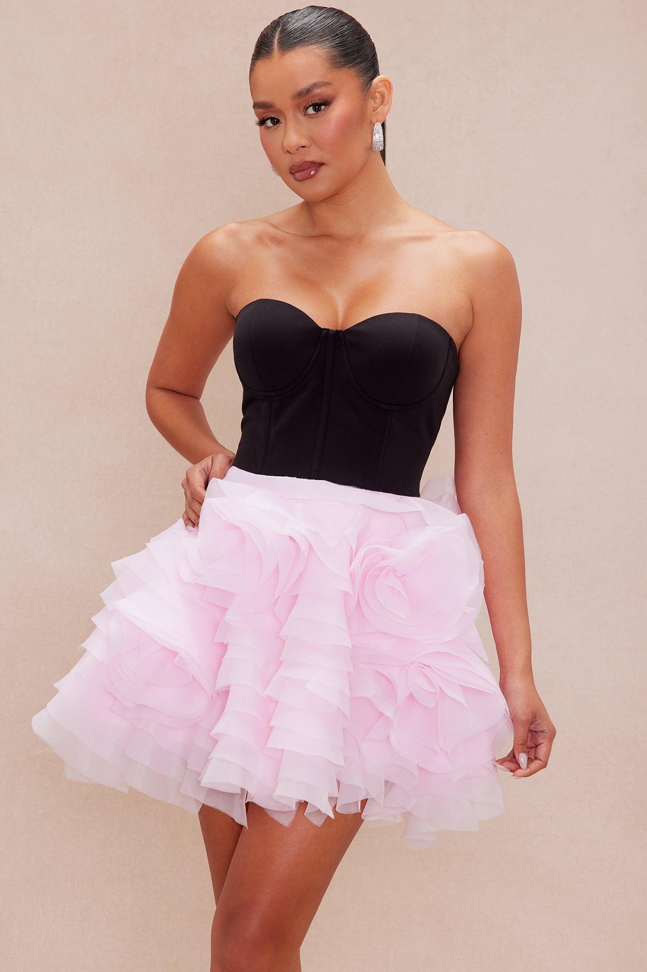 Available In Black/combo. Tulle Mini Dress Sweetheart Neckline Strapless Grip Tape Padded Bra Cups Boning Ruffle Detail Back Zipper Closure Non Stretch Length From Neckline= 27.5'' Shell1&2: 95% Polyester 5% Spandex Lining1&2: 95% Polyester 5% spandex Imported