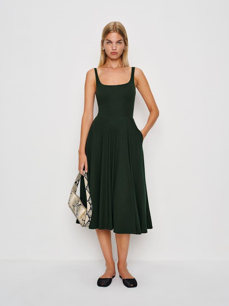 Look cute, be comfortable. Shop the classic Rou Dress from Reformation, a midi length, fit and flare dress with a scoop neckline.