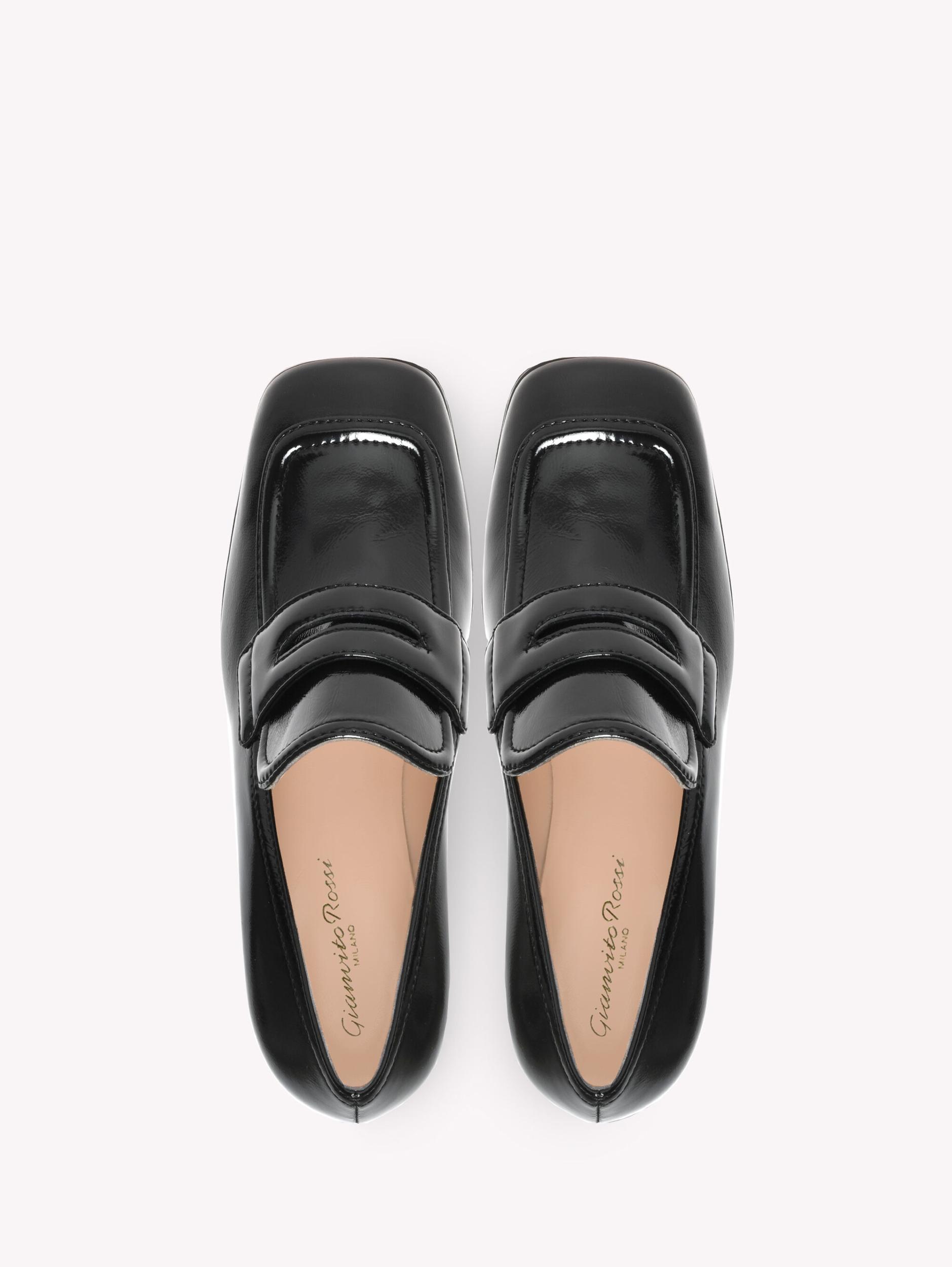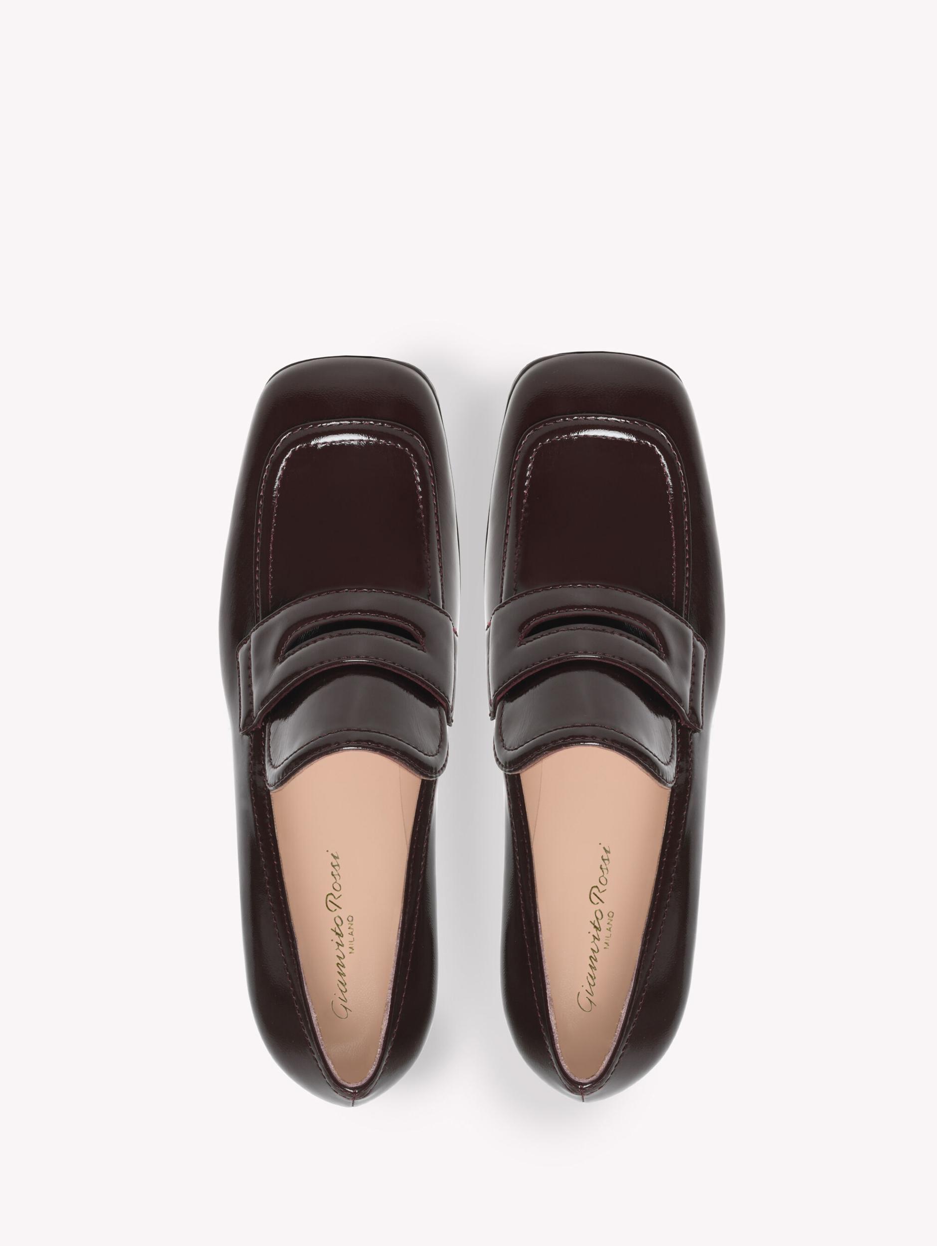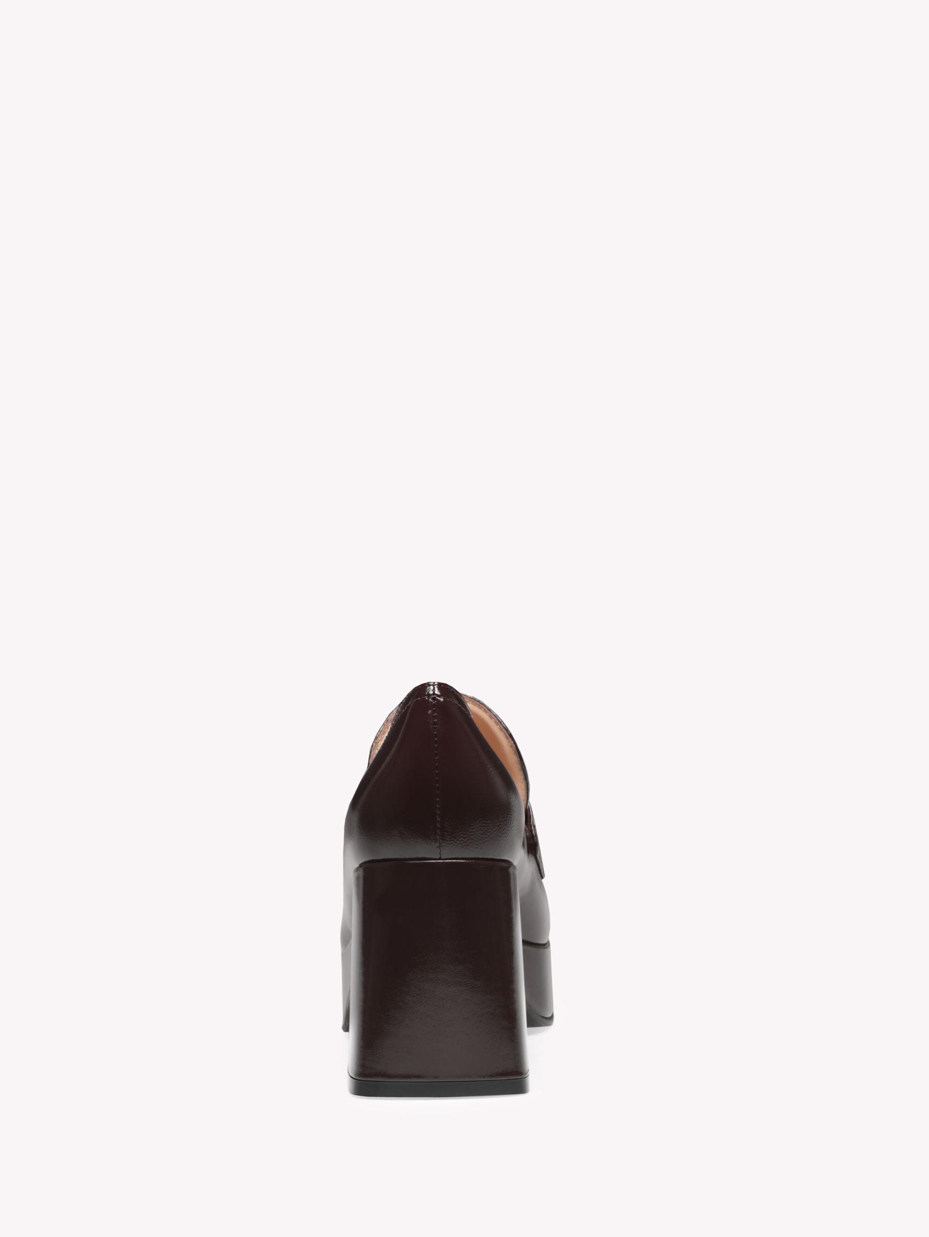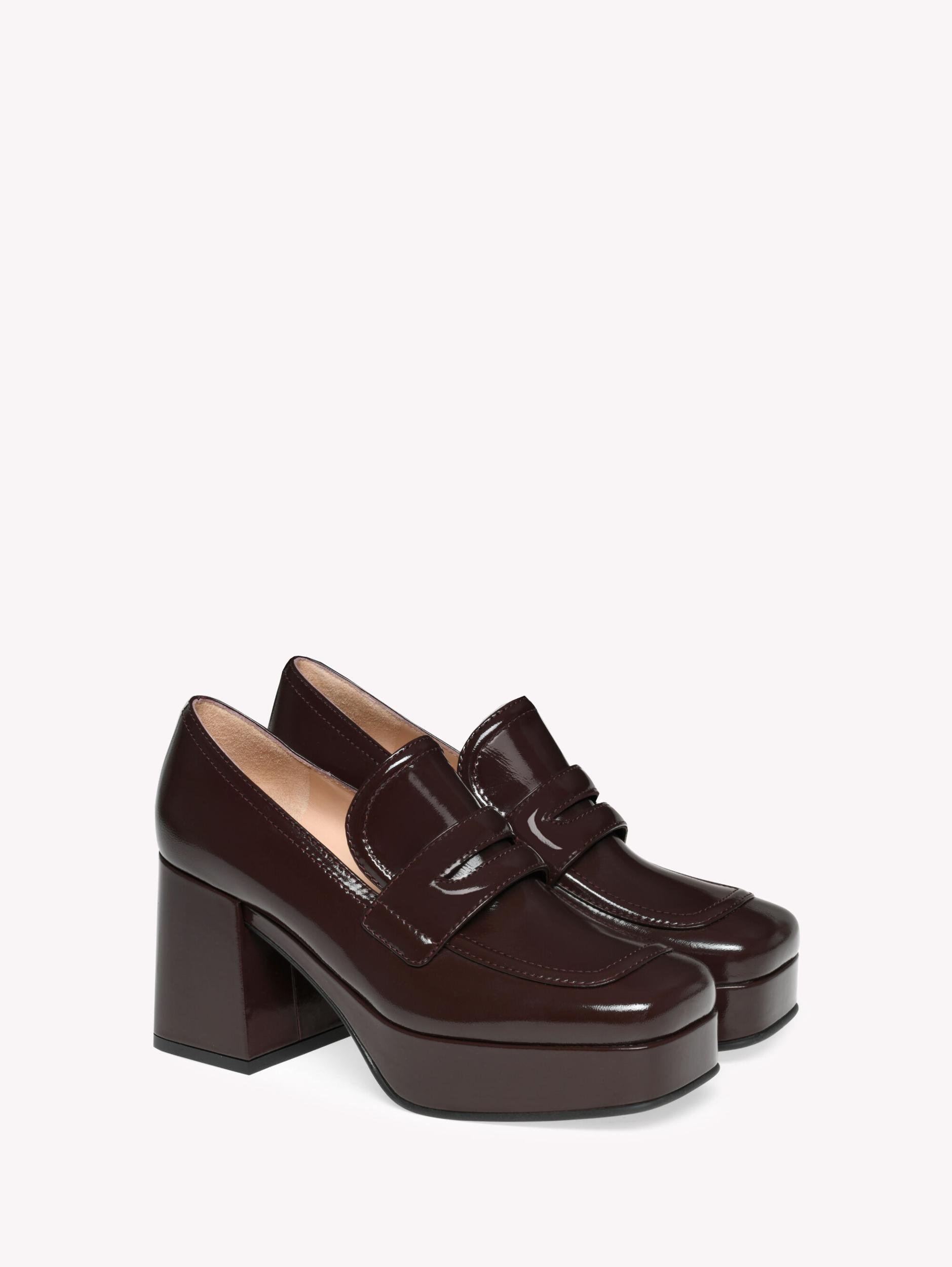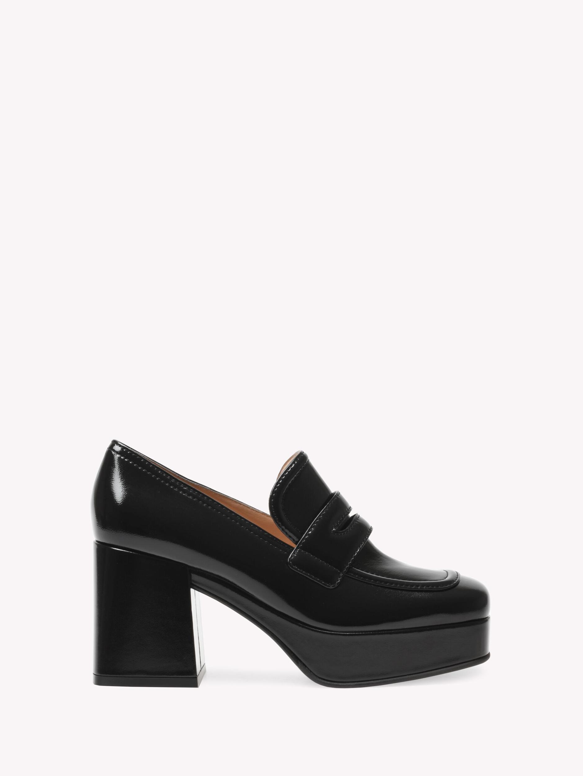 Crafted from soft glossy leather, Rouen 45 is a squared-toe moccasin with a 75mm block heel and 30mm platform. The front presents a slightly padded penny bar. Handmade in Italy.