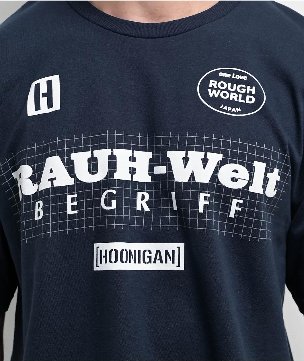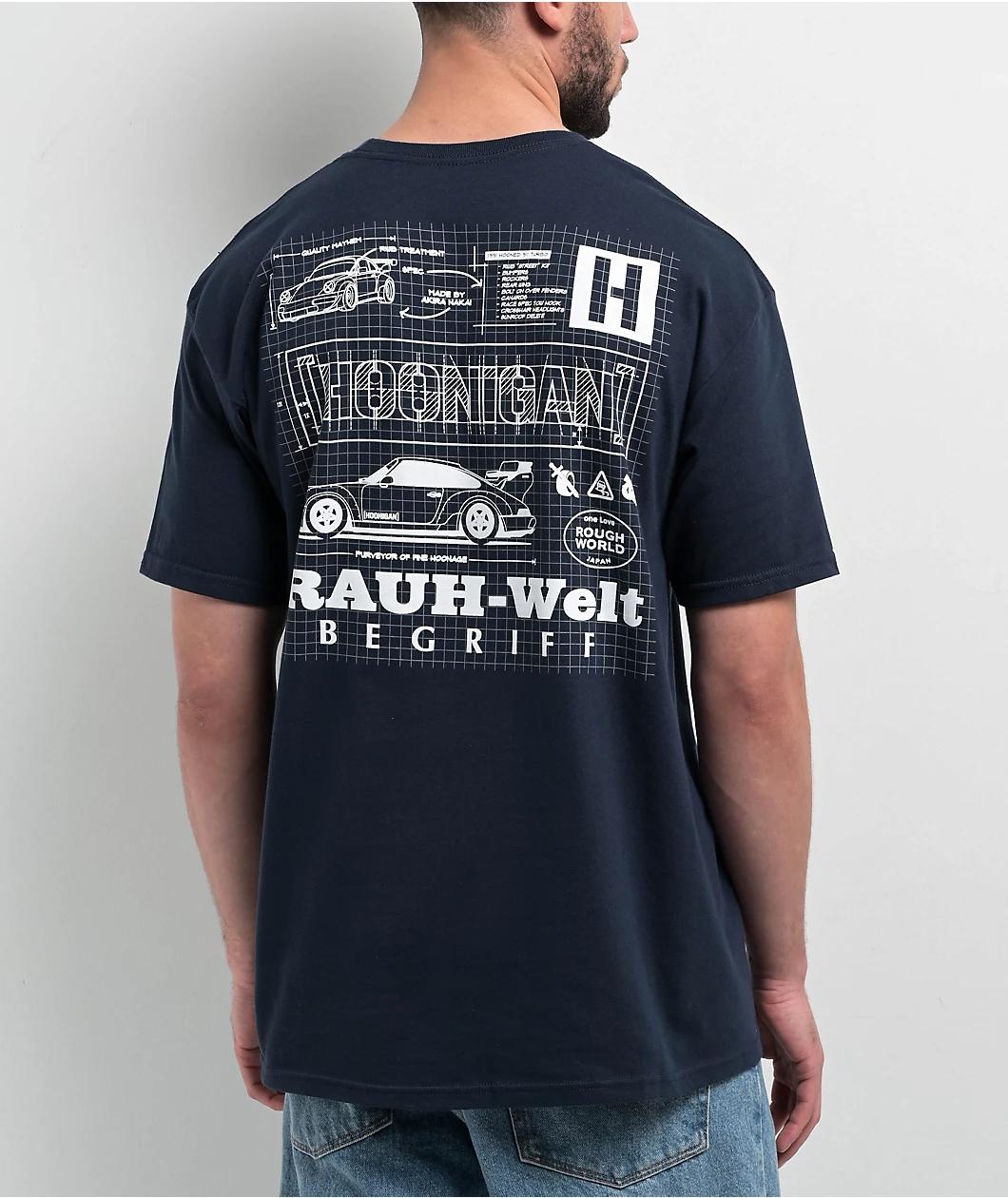 Available from the Rough World (also known as Rauh-Welt Begriff) and Hoonigan collaborative collection in a navy color scheme, the Rauh Welt Grid t-shirt features printed graphics on the front and back. Using a schematic-motif with a Grid pattern in