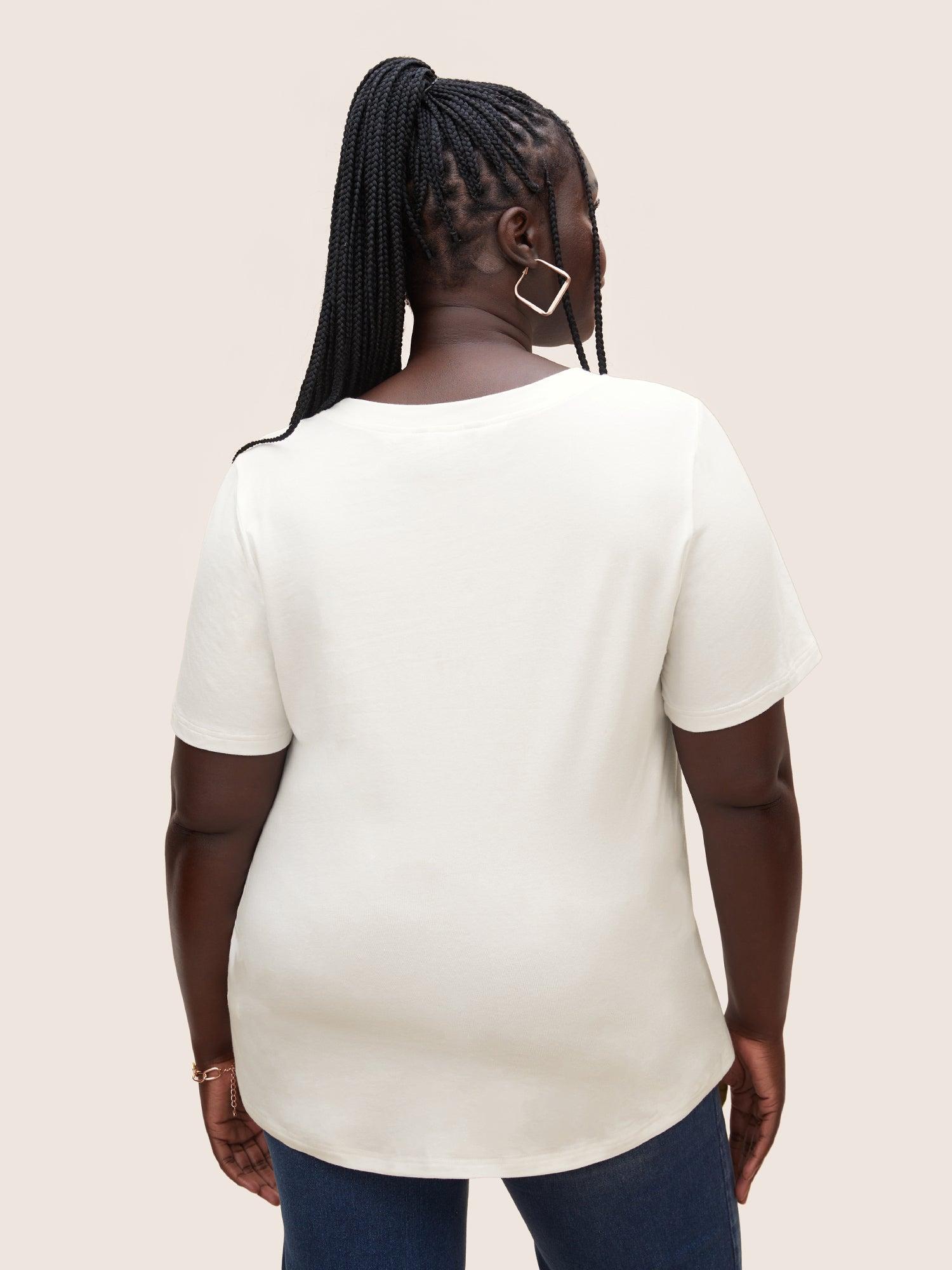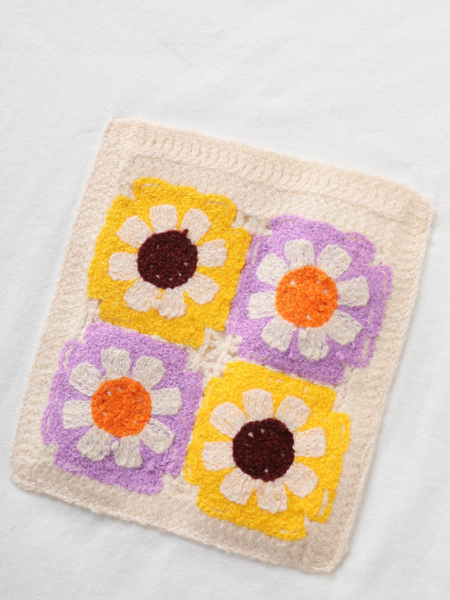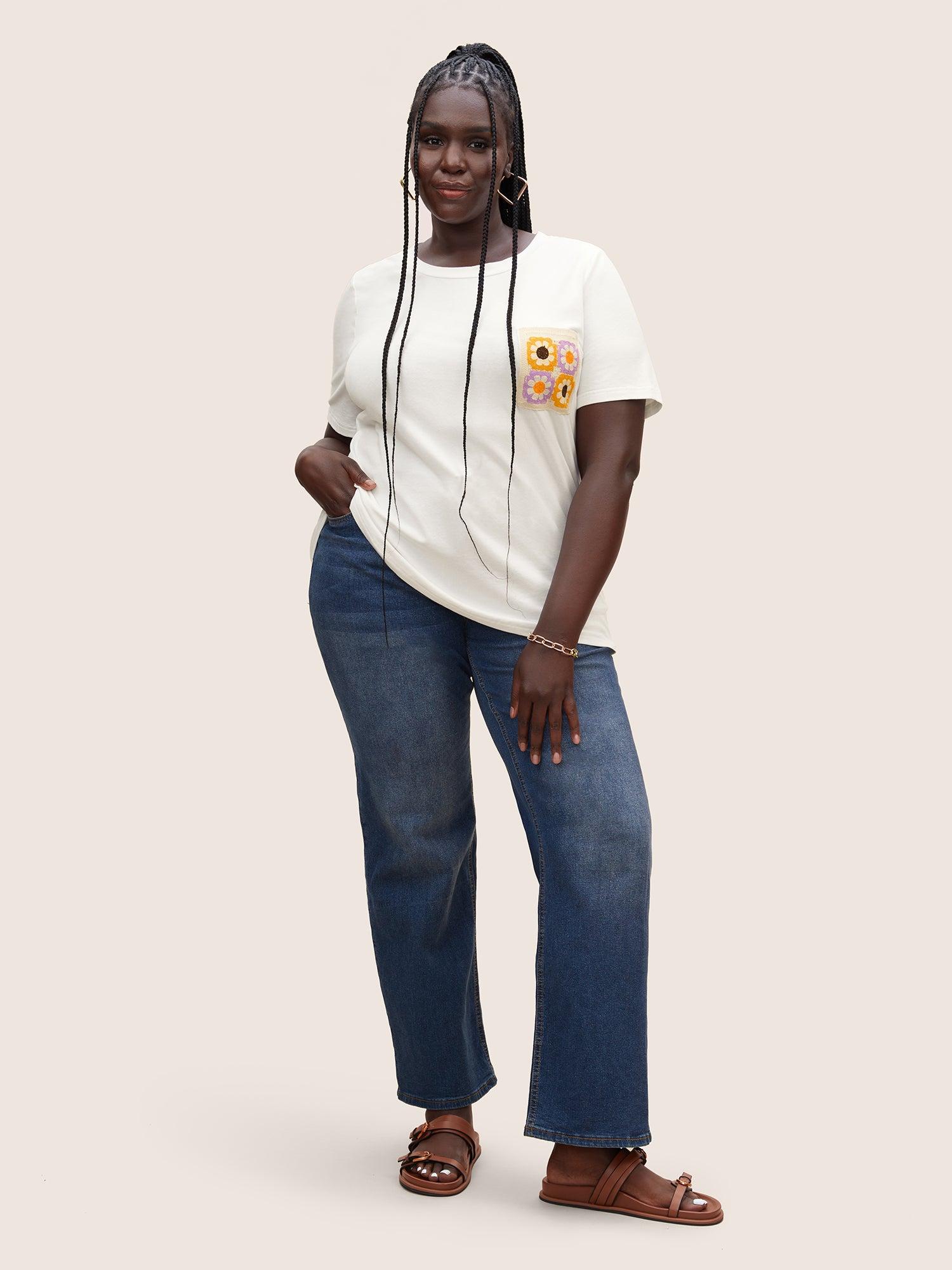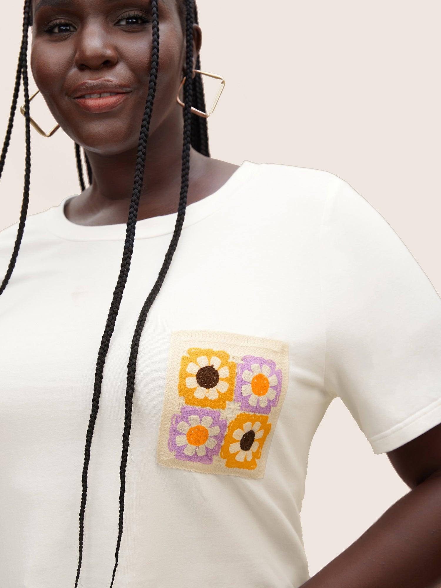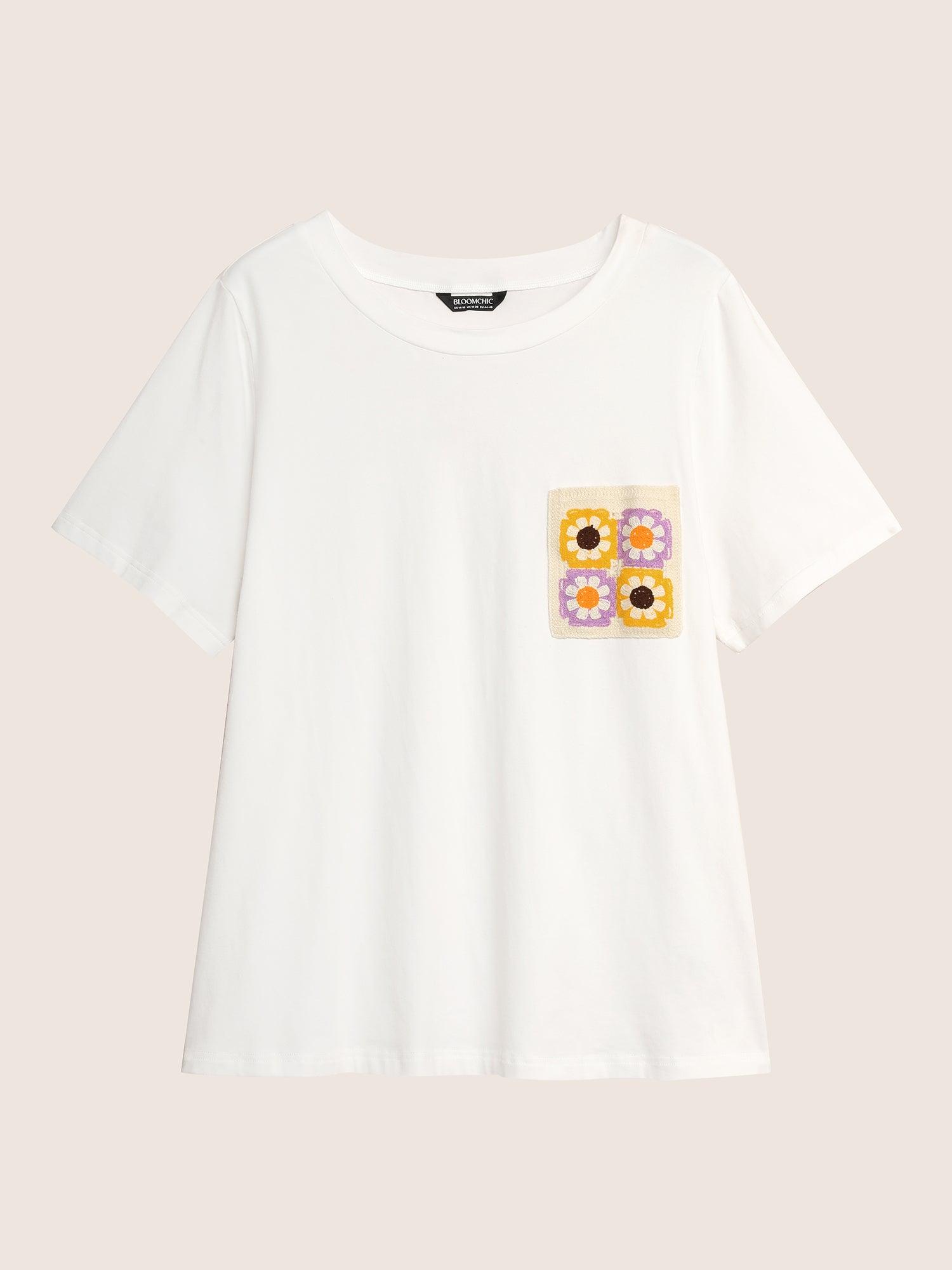 Shop Round Neck Crochet Floral Patch Pocket T-shirt now and redefine your style with confidence at BloomChic. Tailored for mid and plus-size women. This trendy Tops Women, sizes 10-30. Season:Summer;Color:Originalwhite;Style:Resort;Pattern Type:Natural Flowers;Prints:Floral;Neckline:Round Neck;Sleeve Type:Regular Sleeve;Details:Contrast;Pocket:Patch pocket