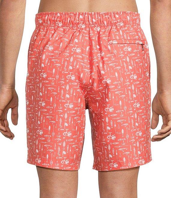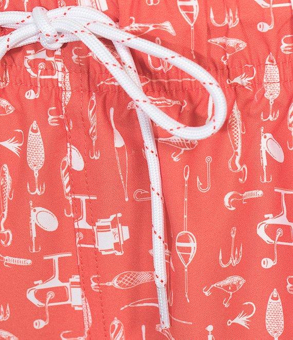 From Roundtree & Yorke, these swim trunks feature:Allover fishing lure designsFull elastic waistband with contrasting interiorExterior drawcordSide entry pocketsInterior coin pocketWelt back pocket with zipper closureMesh brief liner8” inseamPolyesterMachine wash warm/tumble dryImported.