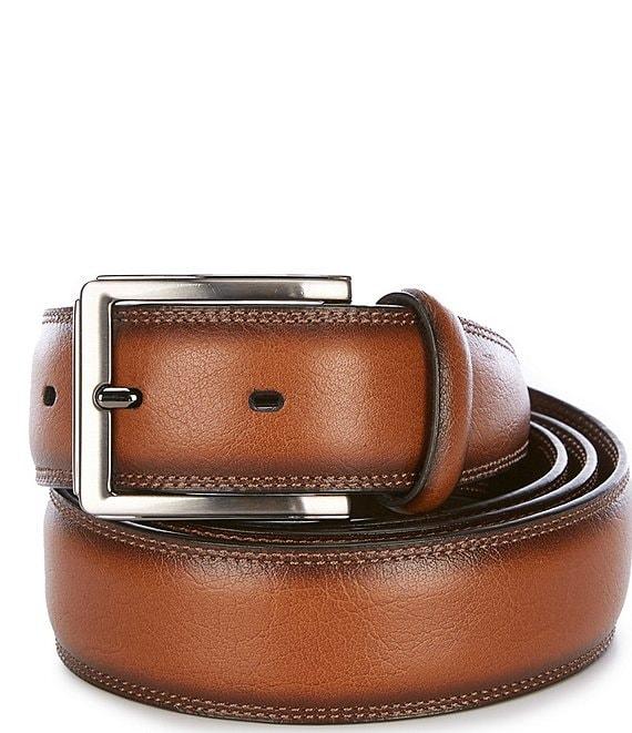 From Roundtree & Yorke, this belt features: 35mm Silver finish Leather Spot clean Imported. Suggested belt size: Take your existing pants size and add two inches. E.g. if your pants size is 32, purchase a size 34.