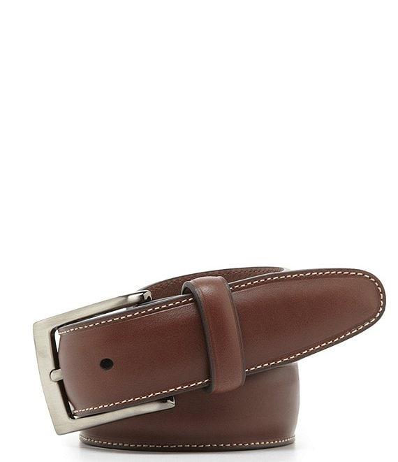 From Roundtree & Yorke, this belt features: oiled full-grain leather dress belt stitch-detailed edges gunmetal buckle leather keeper Imported.