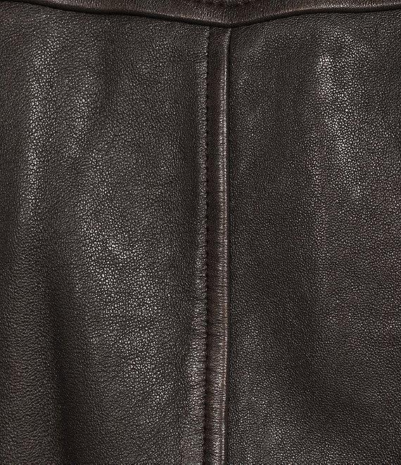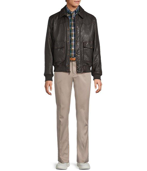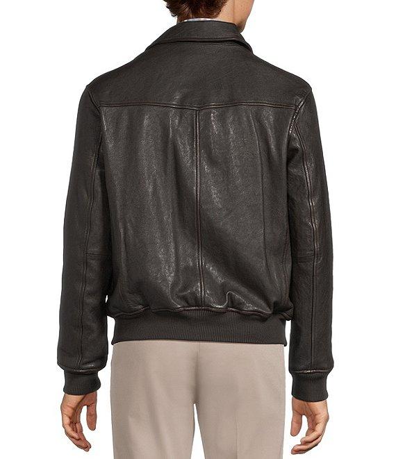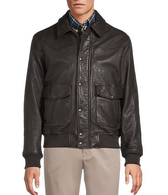 From Roundtree & Yorke, this jacket features: Classic fit Lambskin Distressed finish Shirt collar Long sleeves Ribbed hem and sleeve cuffs Full-zip front with storm flap and snap closure Front hip drop-in patch pockets with snap closure and additional side entry pockets 3 interior drop-in pockets Leather Crafted to Last Professional leather clean Dillard's Exclusive Imported.