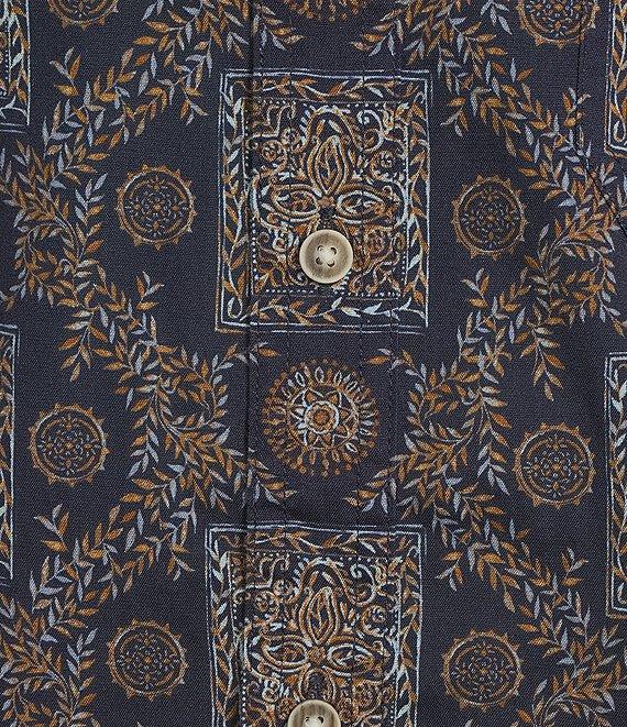 From Rowm, this shirt features:Allover bandana printPoint collarShort sleevesButton-front closureLeft side chest pocket with single-button closureShirttail hemCotton/spandexMachine wash/tumble dryImported.