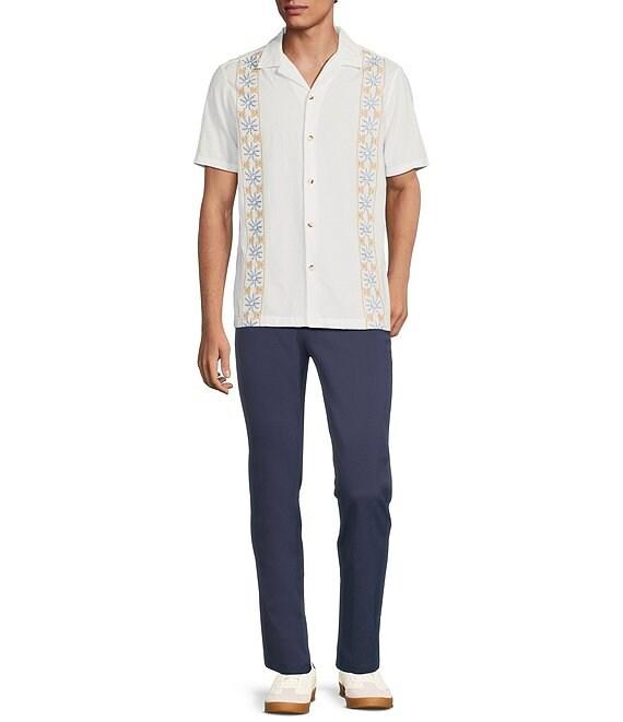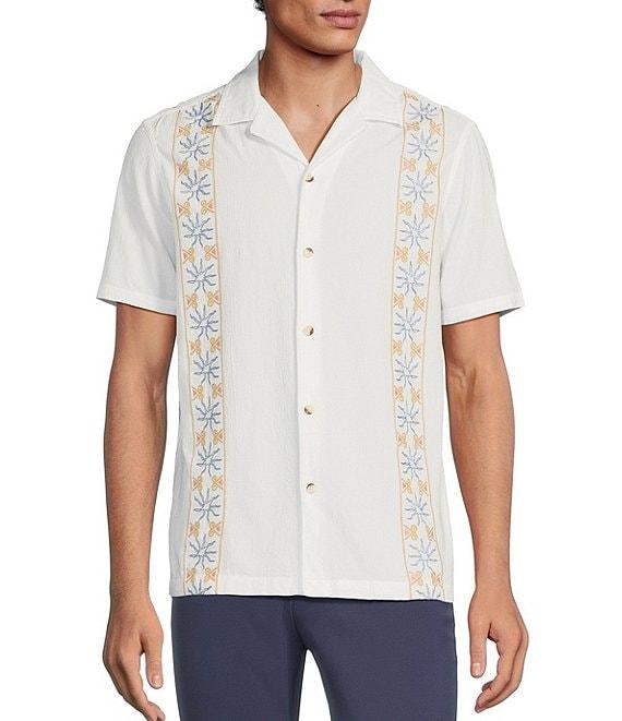 From Rowm, this shirt features: Stripe embroidery Camp collar Short sleeves Button-front closure Seersucker fabric Cotton/spandex Machine wash/tumble dry Imported.