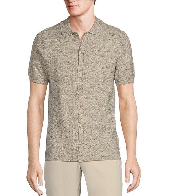 From Rowm, this shirt features: Solid tone Textured heather Point collar Short sleeves Button-front closure Squaretail hem Sweater knit fabric Cotton/polyester/linen Machine wash warm/tumble dry Imported.