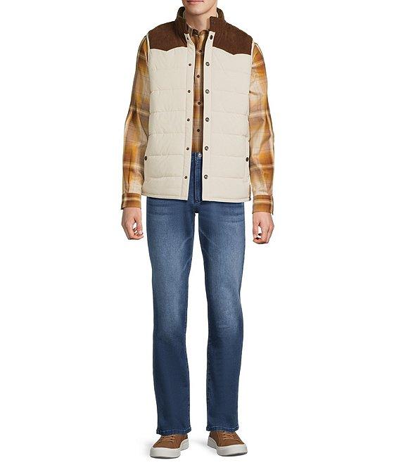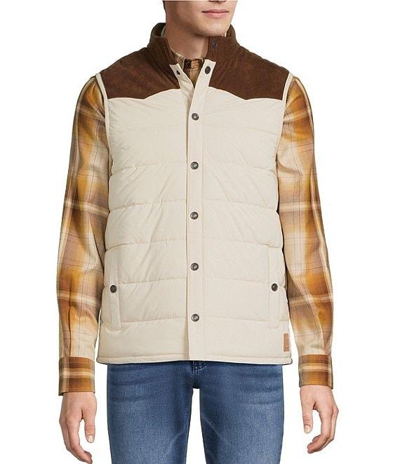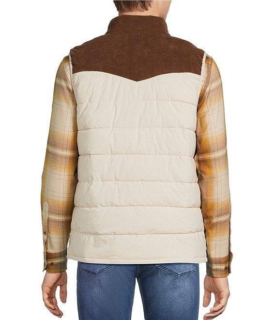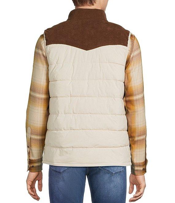 From Rowm, this quilted vest features: Western detailing Mock neckline Snap-button closure Large snap pockets at the waist Corduroy collar and front/back yoke Polyester/spandex Machine wash warm/tumble dry Imported.