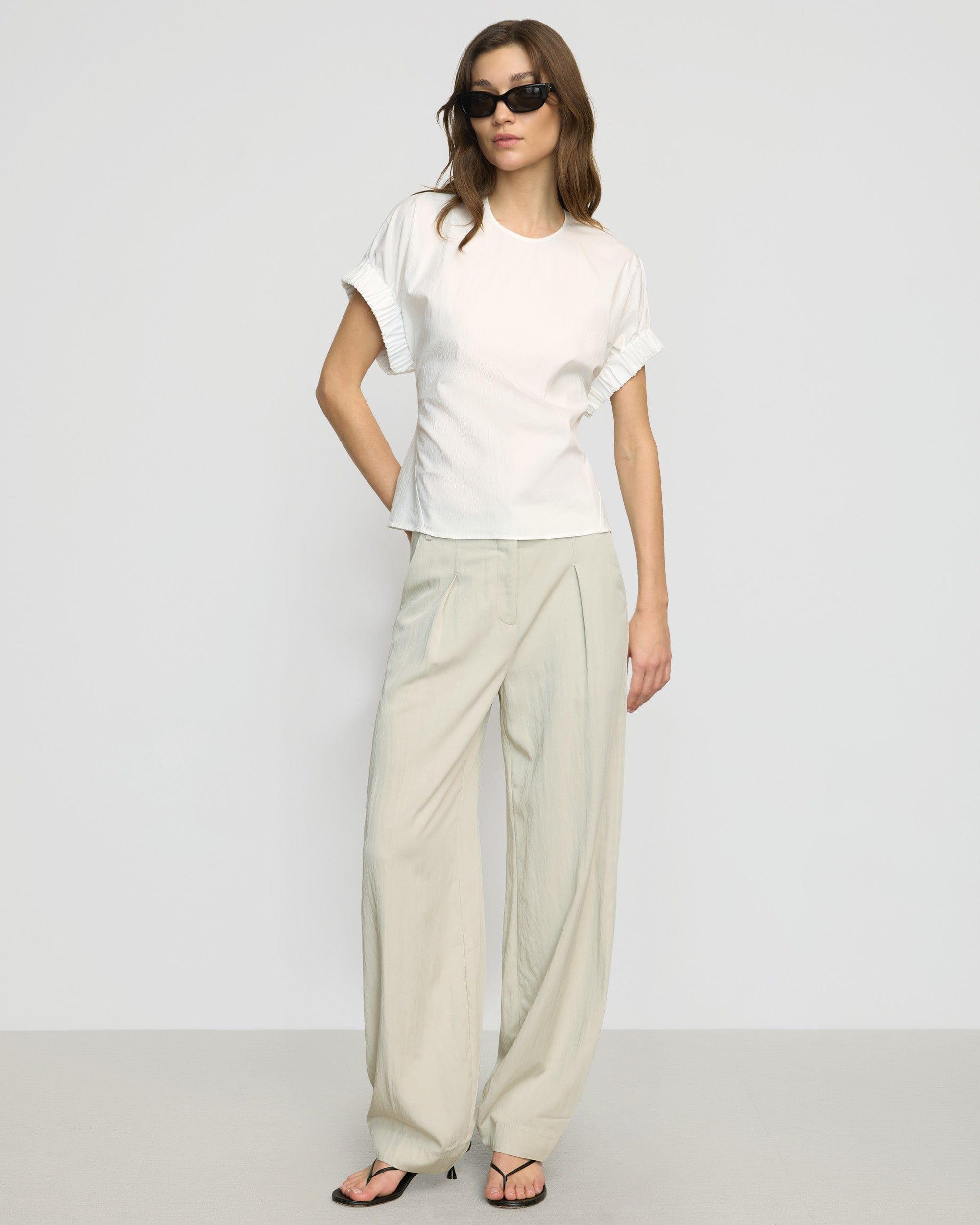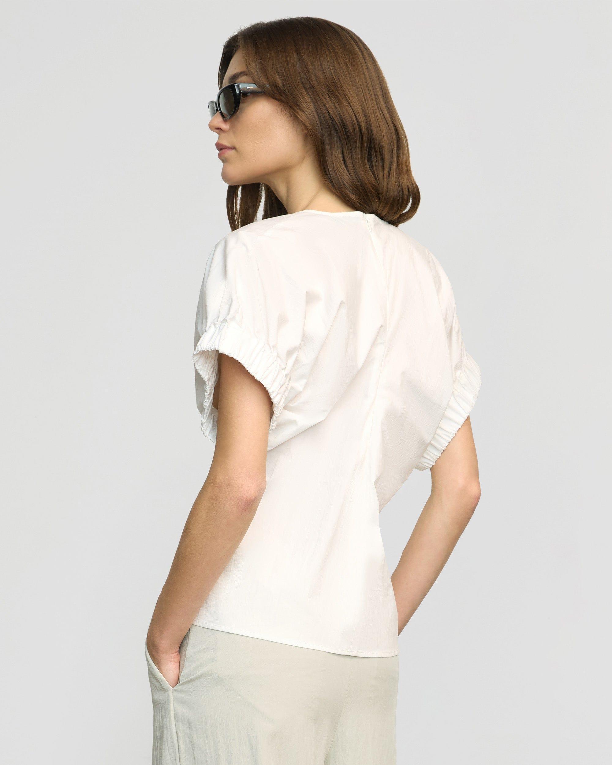 An elevated take on the classic blouse — Roxanne is both lightweight and structured with statement-making architectural elasttic sleeves and a streamlined silhouette.