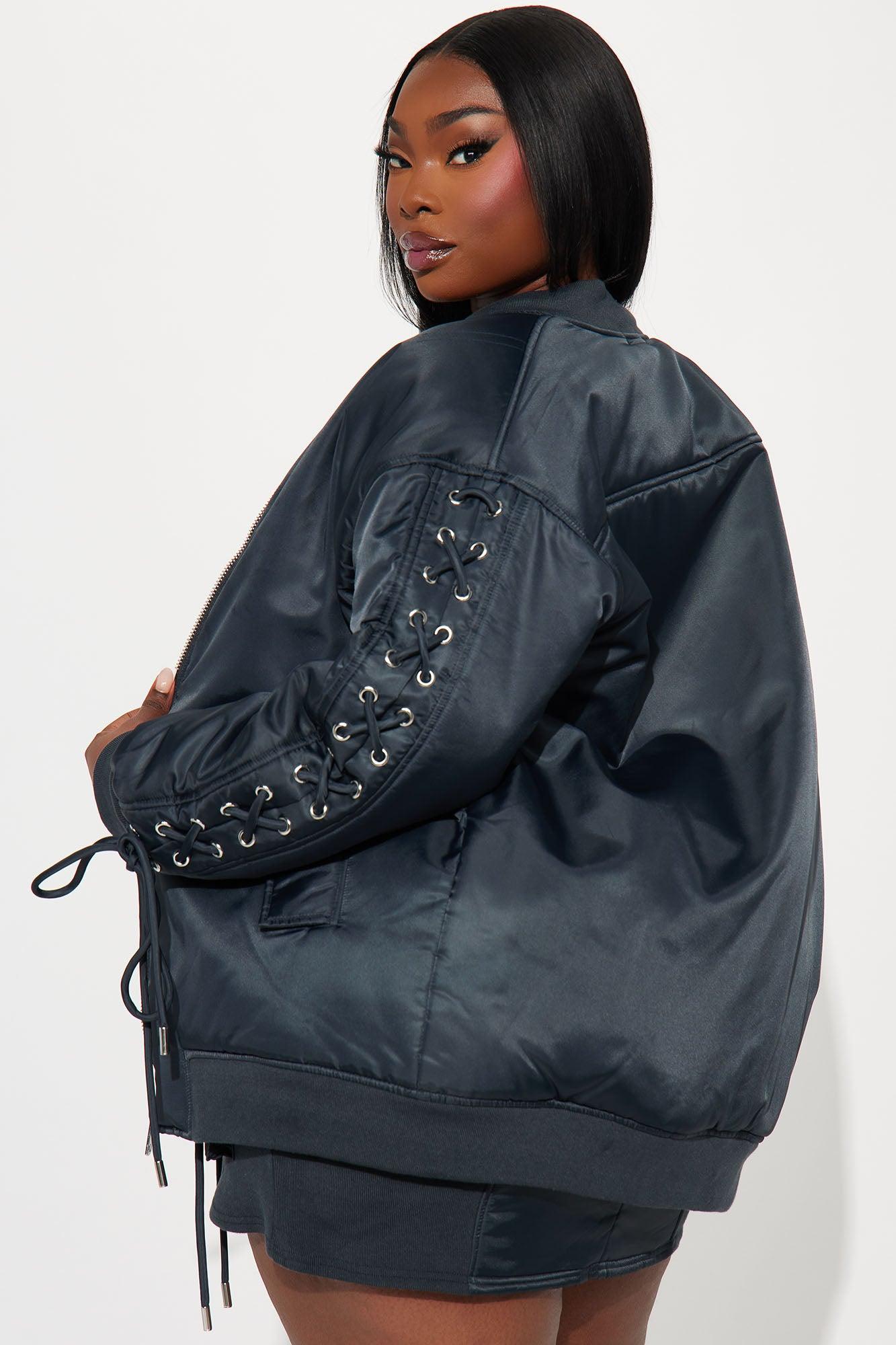 Available In Charcoal. Skirt Set Bomber Jacket Front Zipper Closure Sleeve Lace Up Detail Mini Skirt Cargo Pockets Lace Up Detail Back Zipper Non-Stretch Length: 12 1/2" 100% Nylon Imported California Proposition 65 WARNING: Cancer and Reproductive Harm - www.P65Warnings.ca.gov.