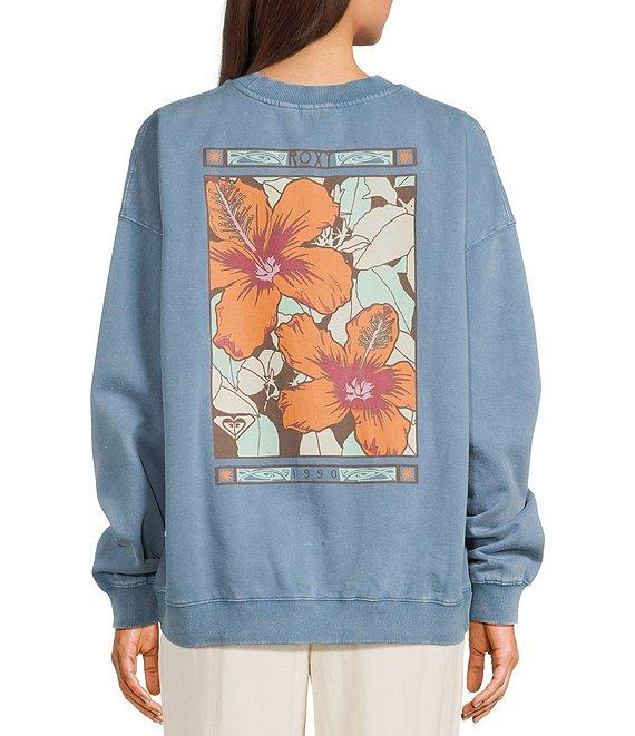 From Roxy, this sweatshirt features: Round neckline Long sleeves "Roxy" logo on the front Large rectangular-shaped graphic with tropical flowers on the back Pullover styling Oversized fit Cotton/recycled cotton/recycled polyester fleece Machine wash/tumble dry Imported.