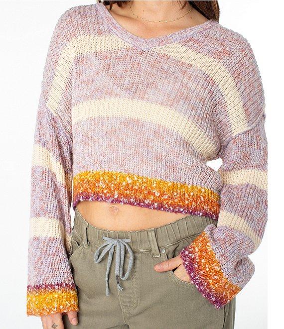From Roxy, this sweater features Wide stripe pattern V-neckline Long sleeves Contrast cuffs and hem Pullover styling Cotton/acrylic/polyester Hand wash/line dry Imported.