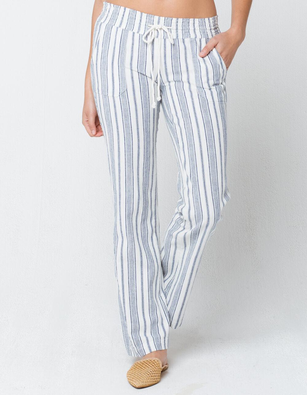 NAVY COMBO. Roxy Oceanside Stripe Beach Pants. Relaxed cotton pants with allover stripe print. Elastic drawstring waist. Front patch pockets. Back patch pockets with Roxy logo at right side. Relaxed fit. Approx. inseam: 31". 85% cotton/15% linen. Machine wash. Imported.