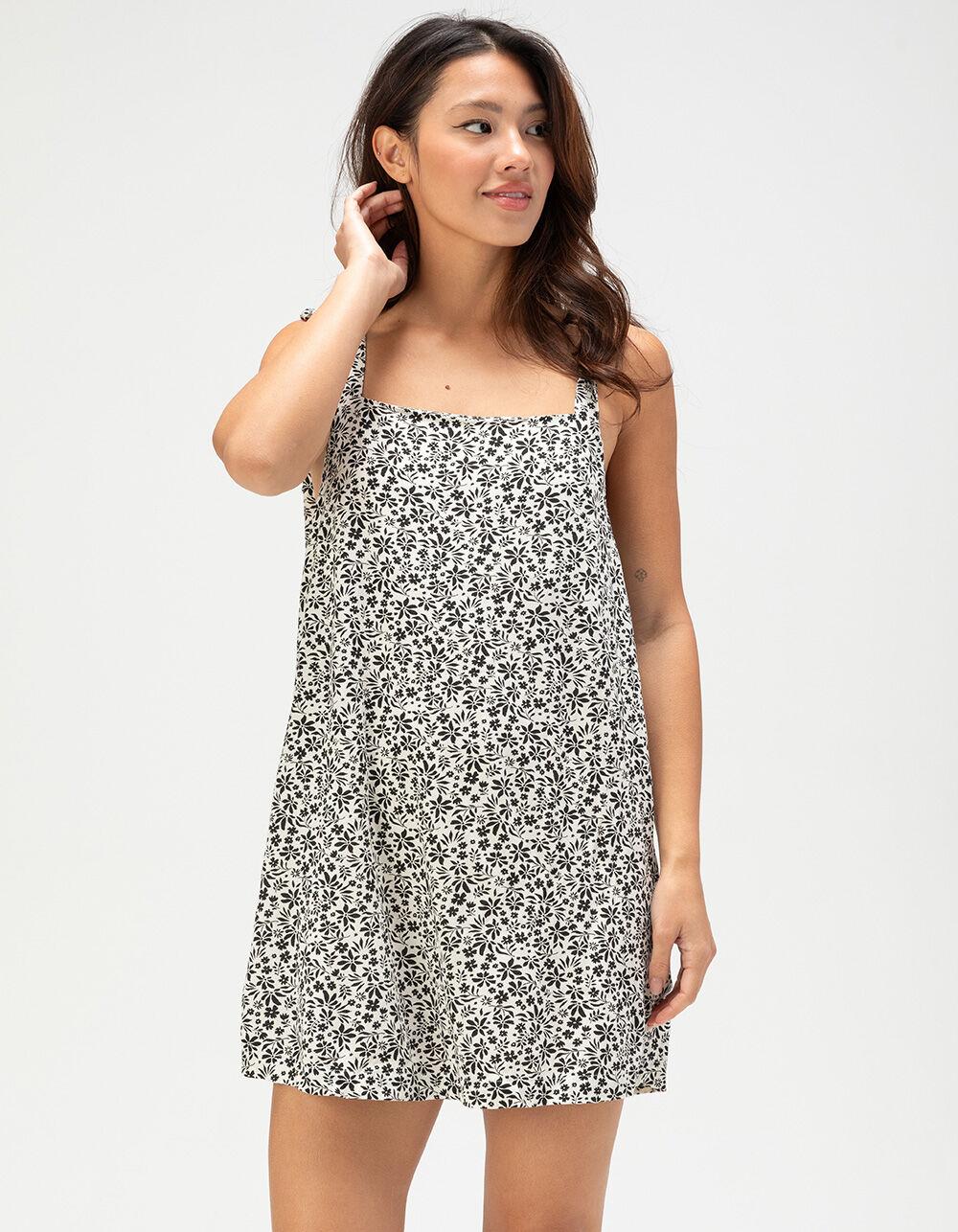 WHT/BLK. Roxy Sunny Adeleaide Mini Dress. Sustainable viscose crepe dress with an allover floral print. Sleeveless design with adjustable straps. Elastic at upper back. Approximate length: 33". 100% Viscose. Machine wash. Imported.