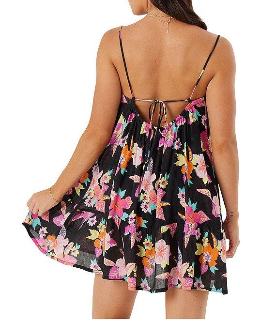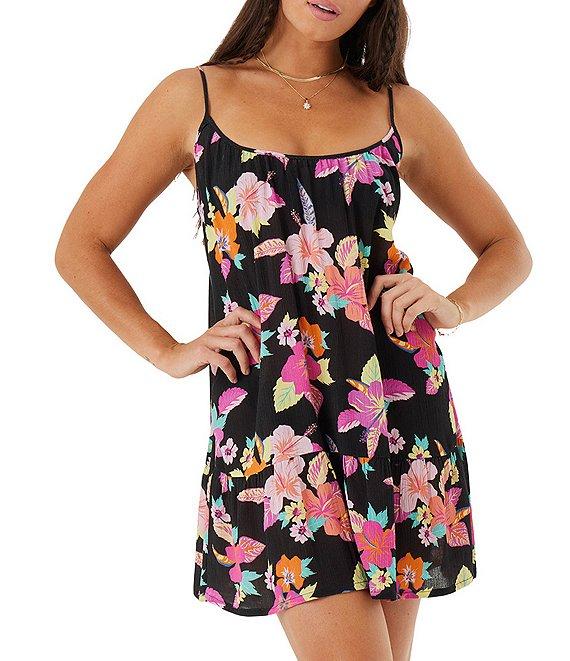 From Roxy, this swim cover-up features: Crinkle viscose eco fabrication Mini dress silhouette Floral print Scoop neckline Adjustable spaghetti straps Tie straps at center back Unlined Tiered ruffle hemline Pullover construction Approx. 32" length Viscose Hand wash Imported.