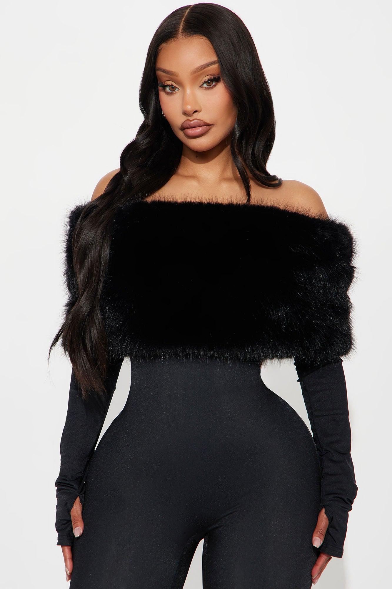Available In Black. Jumpsuit Stretch Long Sleeve Detachable Faux Fur Off Shoulder Invisible Back Zipper Skinny Leg 31" Inseam Self & Lining: 100% Polyester Contrast: 82% Nylon 18% Spandex Imported California Proposition 65WARNING: Cancer and Reproductive Harm - www.P65Warnings.ca.gov.