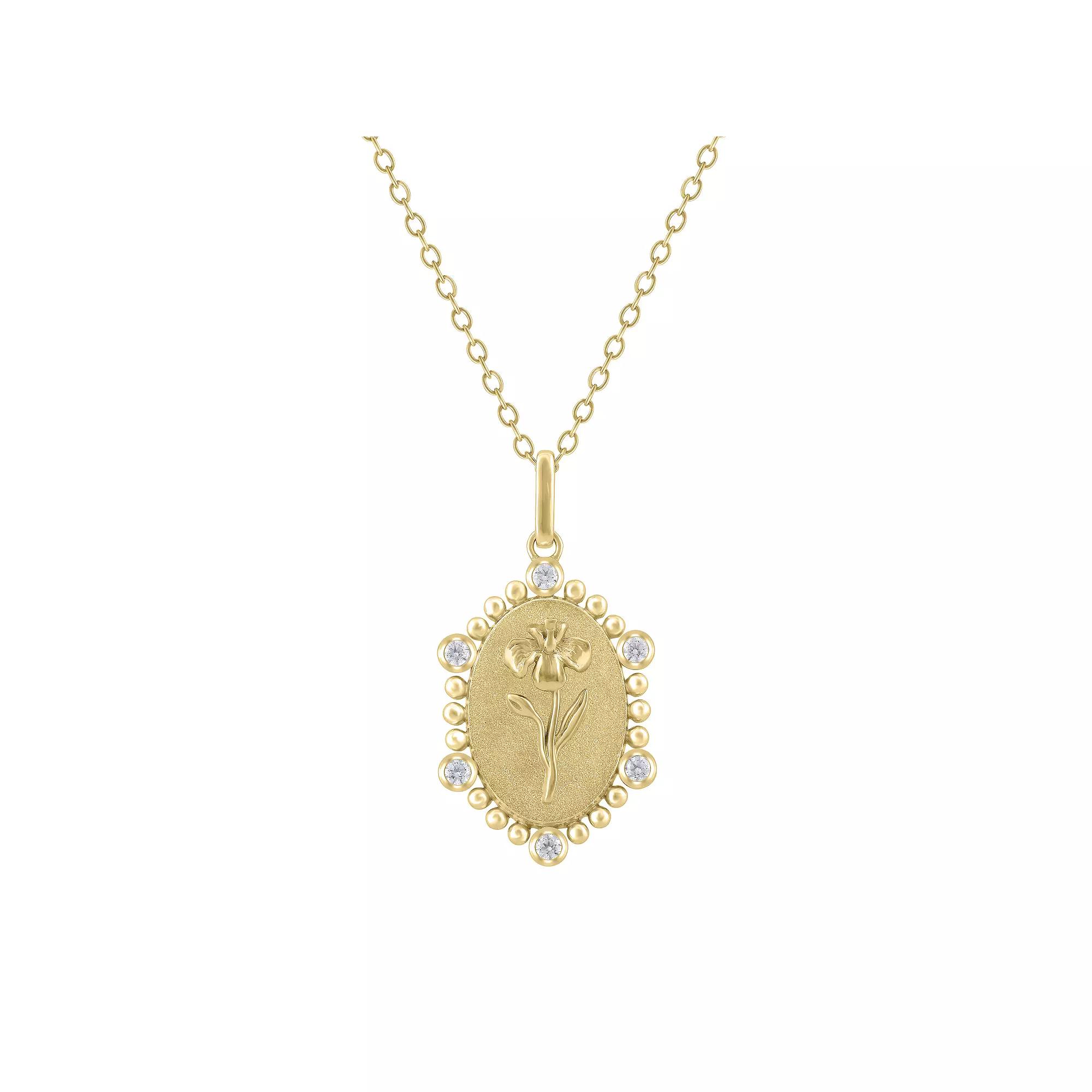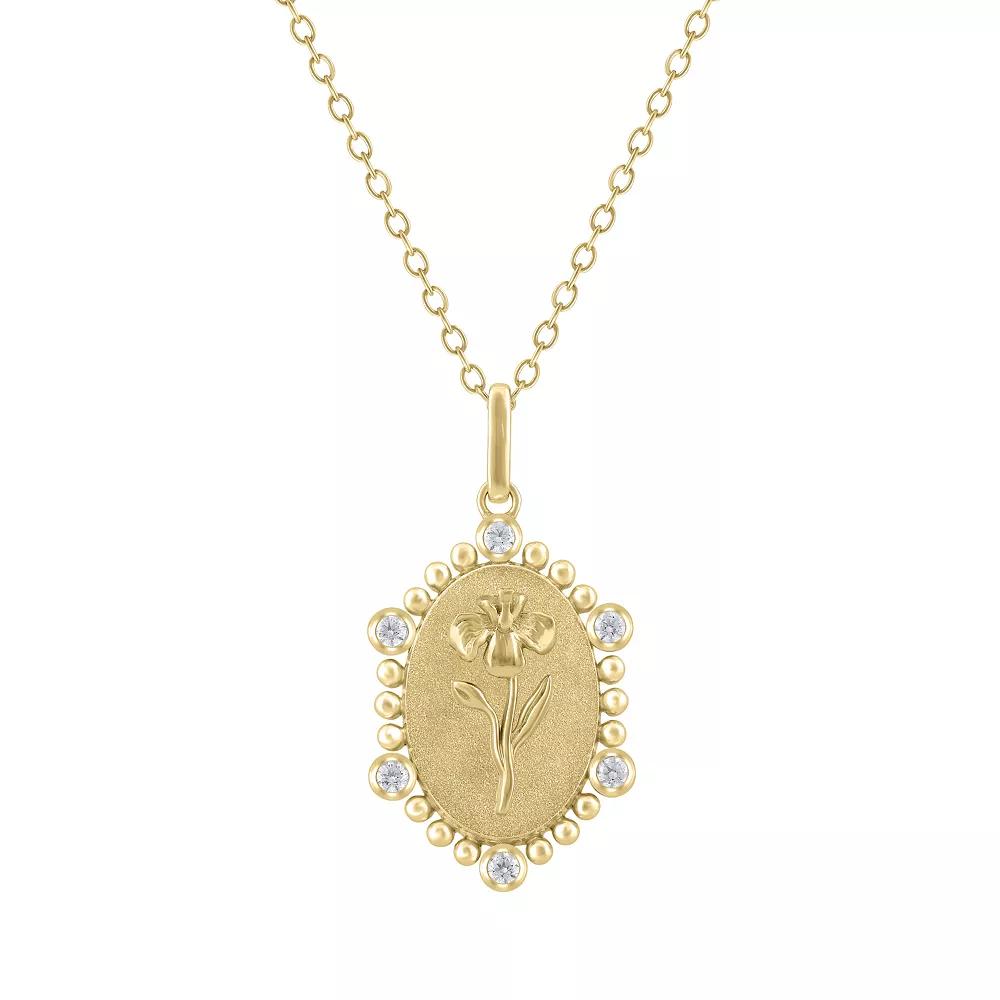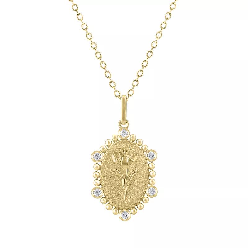 Accessorize in style with this Royal Aura sterling silver 1/10 carat T.W. diamond birth flower February iris pendant necklace. Click on this JEWELRY & WATCHES GUIDE to learn about fit, styles, materials and more! Accessorize in style with this Royal Aura sterling silver 1/10 carat T.W. diamond birth flower February iris pendant necklace. Click on this JEWELRY & WATCHES GUIDE to learn about fit, styles, materials and more! FEATURES Chain length: 18 in. Chain type: cable Clasp: lobster-claw Nickel free Metal: sterling silver Plating: 14k gold, silver tone Finish: polished Packaging: boxedDIAMOND DETAILS Total weight: 1/10 ct. Shape: round Setting: prong Gemstones may have been treated to enhance their appearance. Special care may be required. Please visit our Gemstone Treatment & Special Care Guide for more information. Diamond weights are approximate. Diamond Total Weights may vary between .01 and .13 ct. Some diamonds consist of fewer than 17 facets. Image(s) may be enlarged to show detail. Size: 18". Color: Gold Tone. Gender: female. Age Group: adult. Material: Gold Over Sterling.
