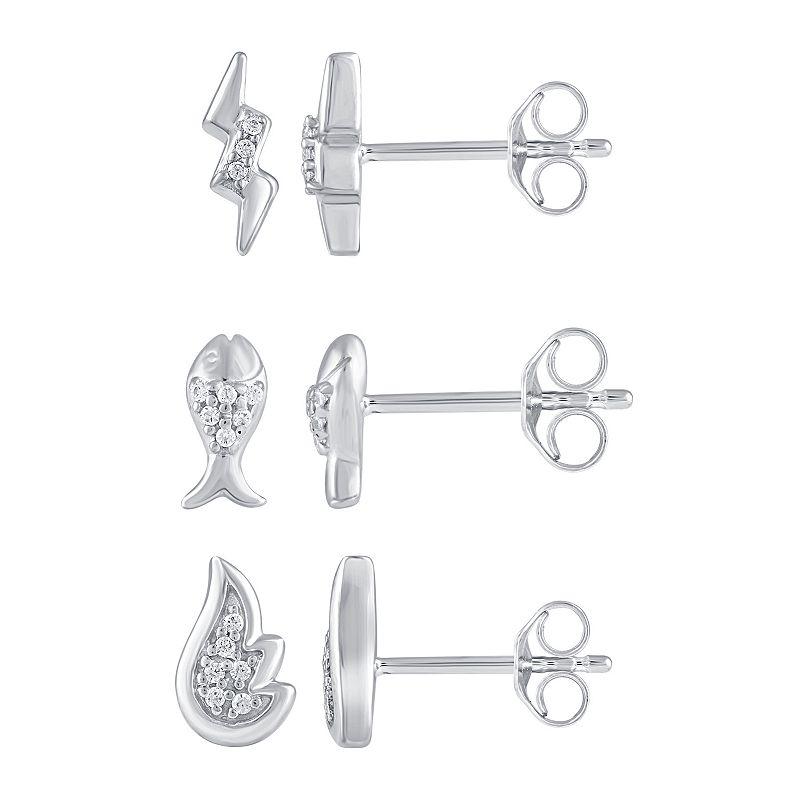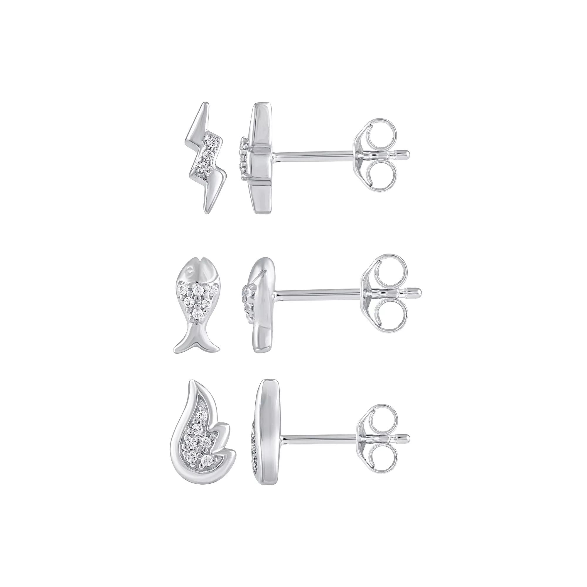 Complete with three pairs of stud earrings in a variety of styles, this sterling silver earring set provides chic accessorizing options. Complete with three pairs of stud earrings in a variety of styles, this sterling silver earring set provides chic accessorizing options. Metal: sterling silver Backings: post Packaging: boxed Finish: polished Length: 3.5 mmDIAMOND DETAILS Total weight: 1/10 ct. Color grade: I-J Clarity: I2-I3 Shape: round brilliant Setting: prong Gemstones may have been treated to enhance their appearance. Special care may be required. Please visit our Gemstone Treatment & Special Care Guide for more information. Image(s) may be enlarged to show detail. Please note, due to the high value of this item, a signature may be required upon delivery. Size: One Size. Color: White. Gender: female. Age Group: adult.