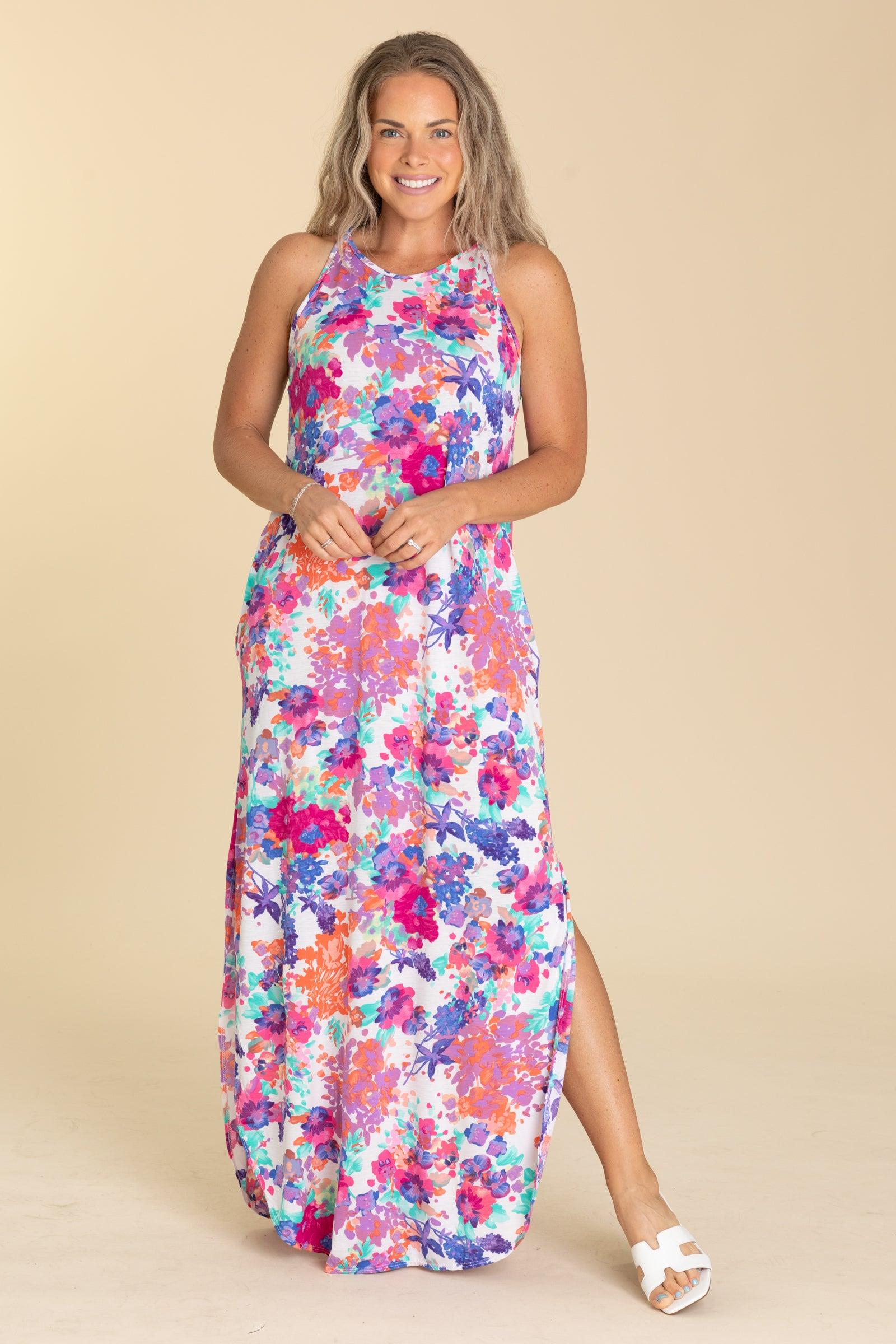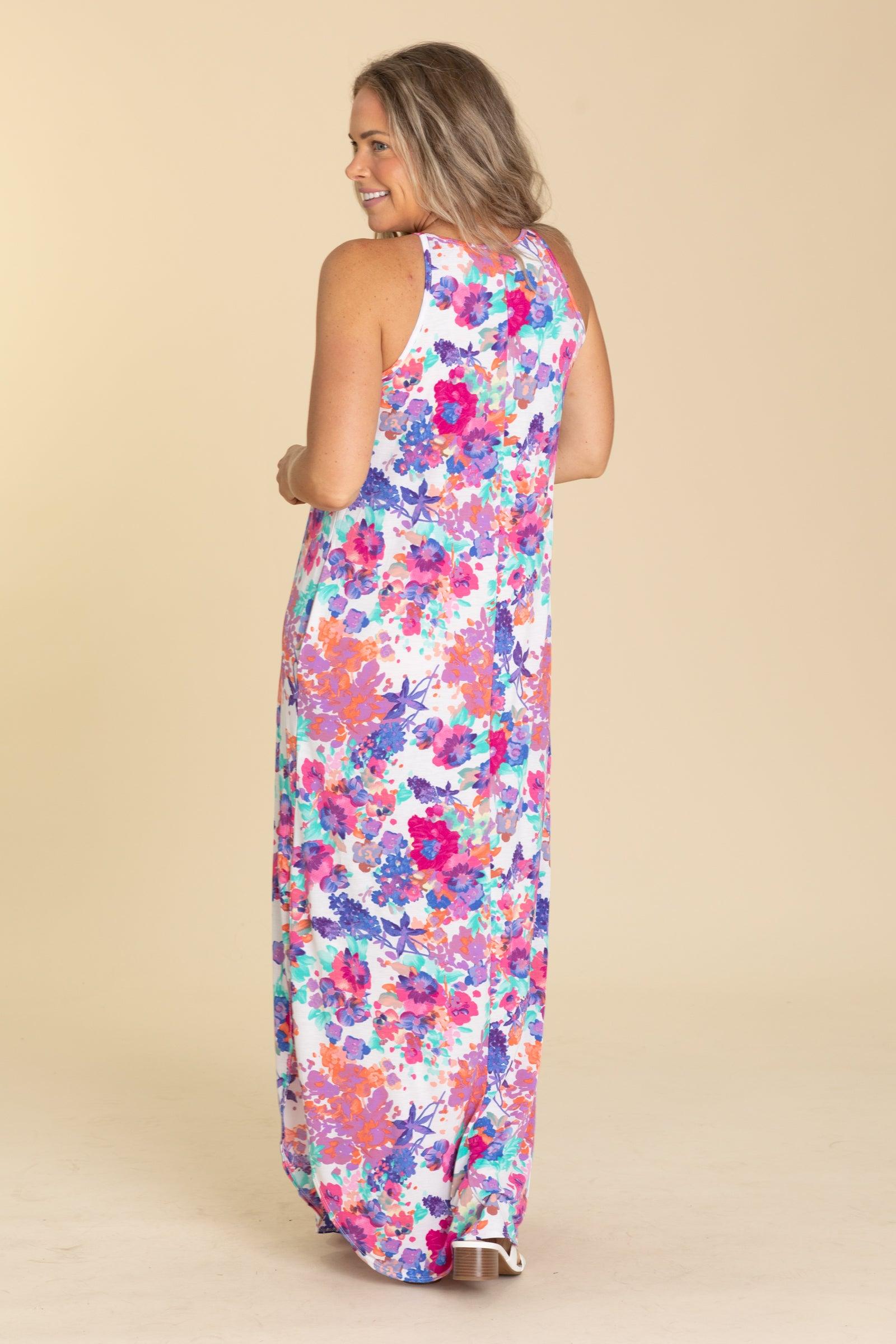 Product Details Colors: Royal Blue, Cobalt, Dusty Blue, Orchid, Lavender, Purple, Fuchsia, Pink, Mint, Ivory, Orange, Peach Print: Floral Neckline: Round Sleeve: Sleeveless Hemline: Round Brand: Heimish Material and Care 95% Polyester 5% Spandex Hand Wash Cold Hang/Line Dry Size and Fit Small: Bust 36" Waist 38" Length 57" Medium: Bust 38" Waist 40" Length 57.5" Large: Bust 40" Waist 42" Length 58" Erica is 5’7” and wearing her true size small