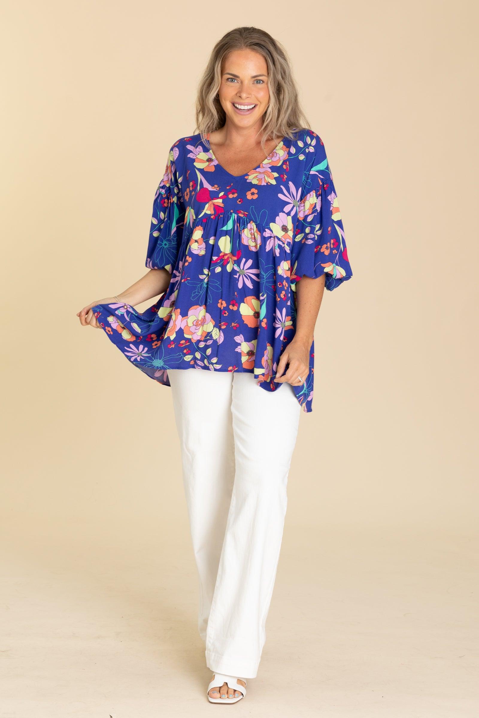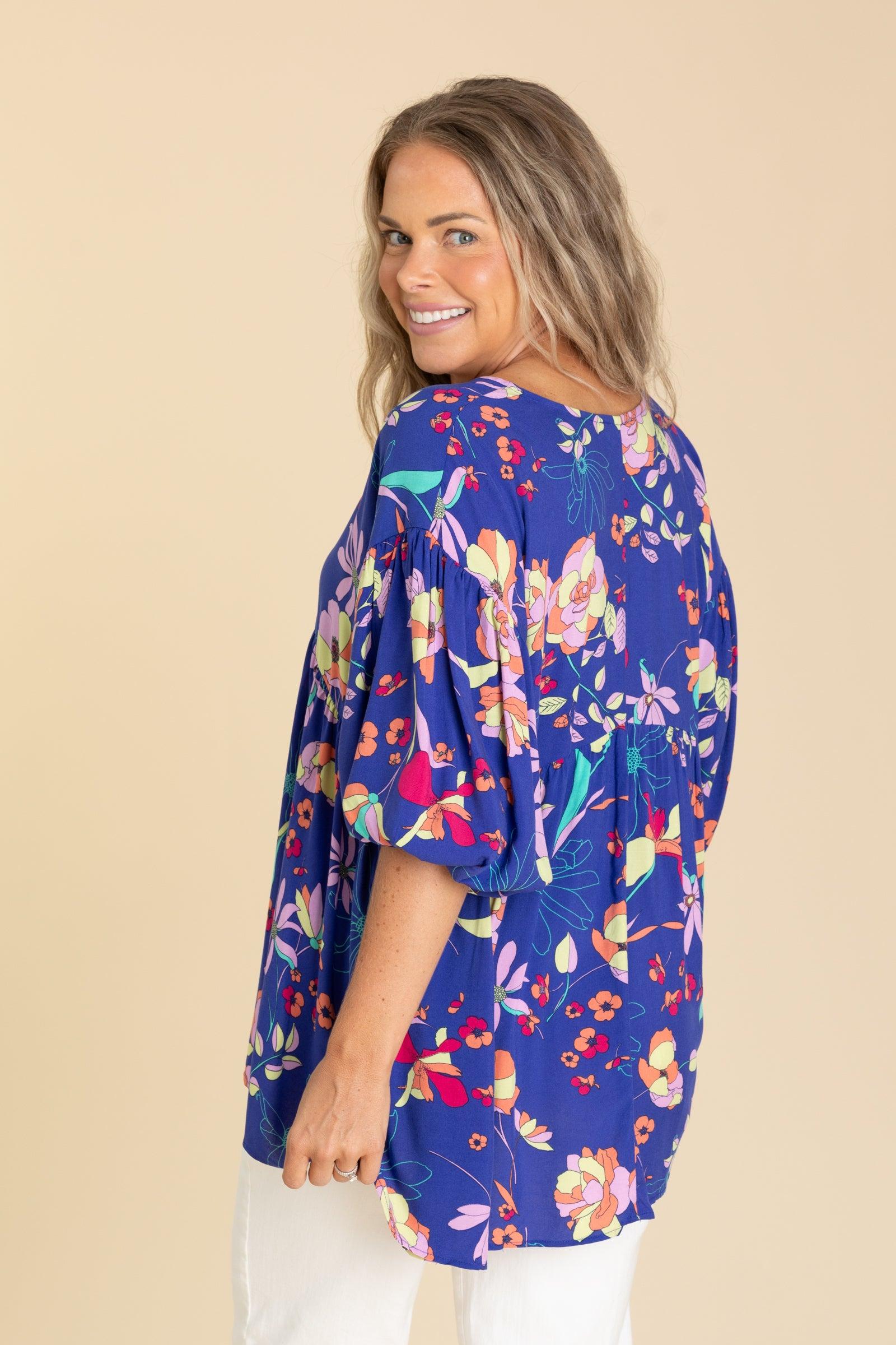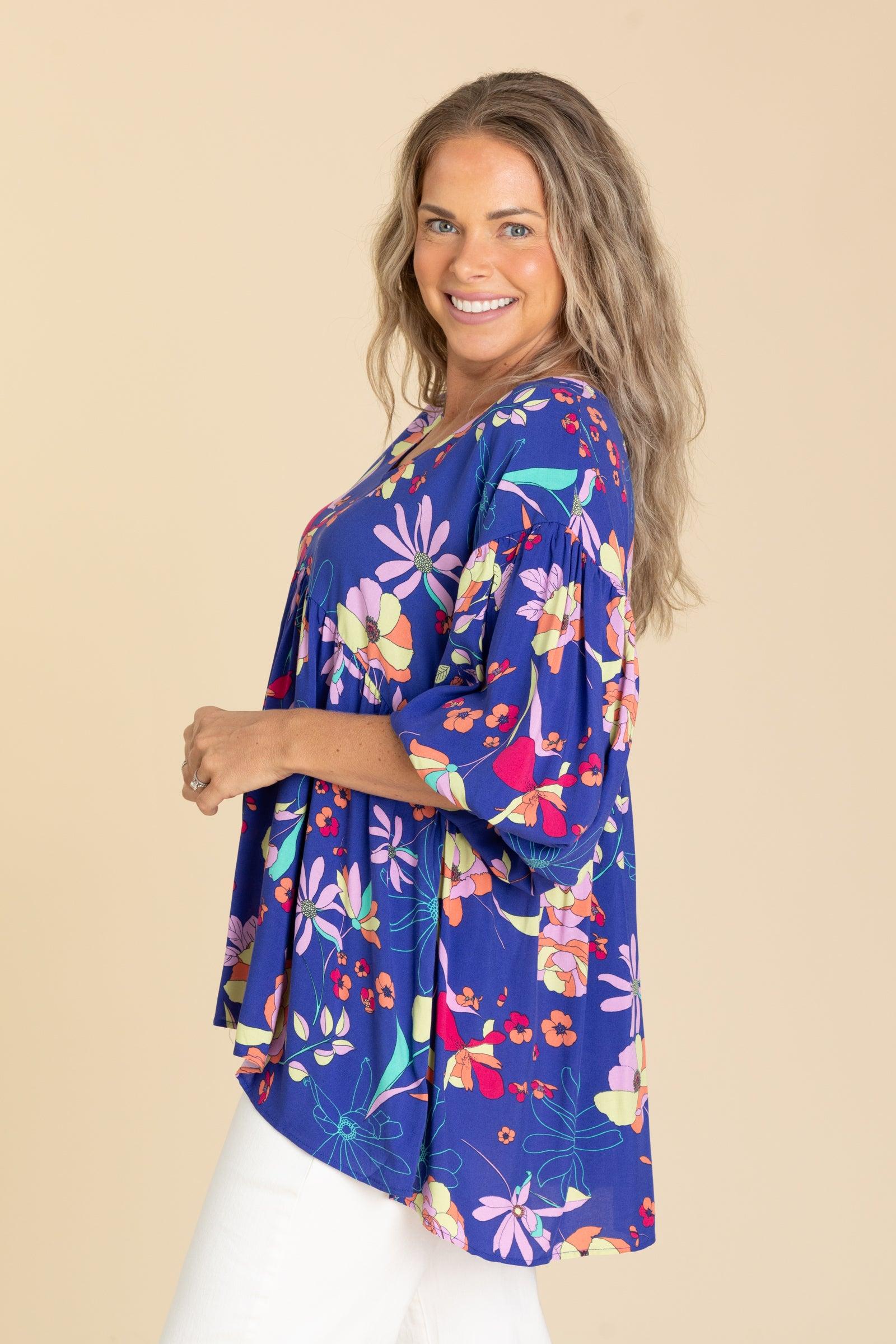 Product Details Colors: Royal Blue, Fuchsia, Coral, Dusty Yellow, Orchid, Turquoise Print: Floral Neckline: V-Neck Sleeve: Half Sleeve Hemline: Straight Brand: Easel Material and Care 100% Rayon Hand Wash Cold Hang/Line Dry Size and Fit Small: Bust 44" Waist 42" Length 28" Medium: Bust 46" Waist 44" Length 28.5" Large: Bust 48" Waist 46" Length 29" Erica is 5’7” and wearing her true size small