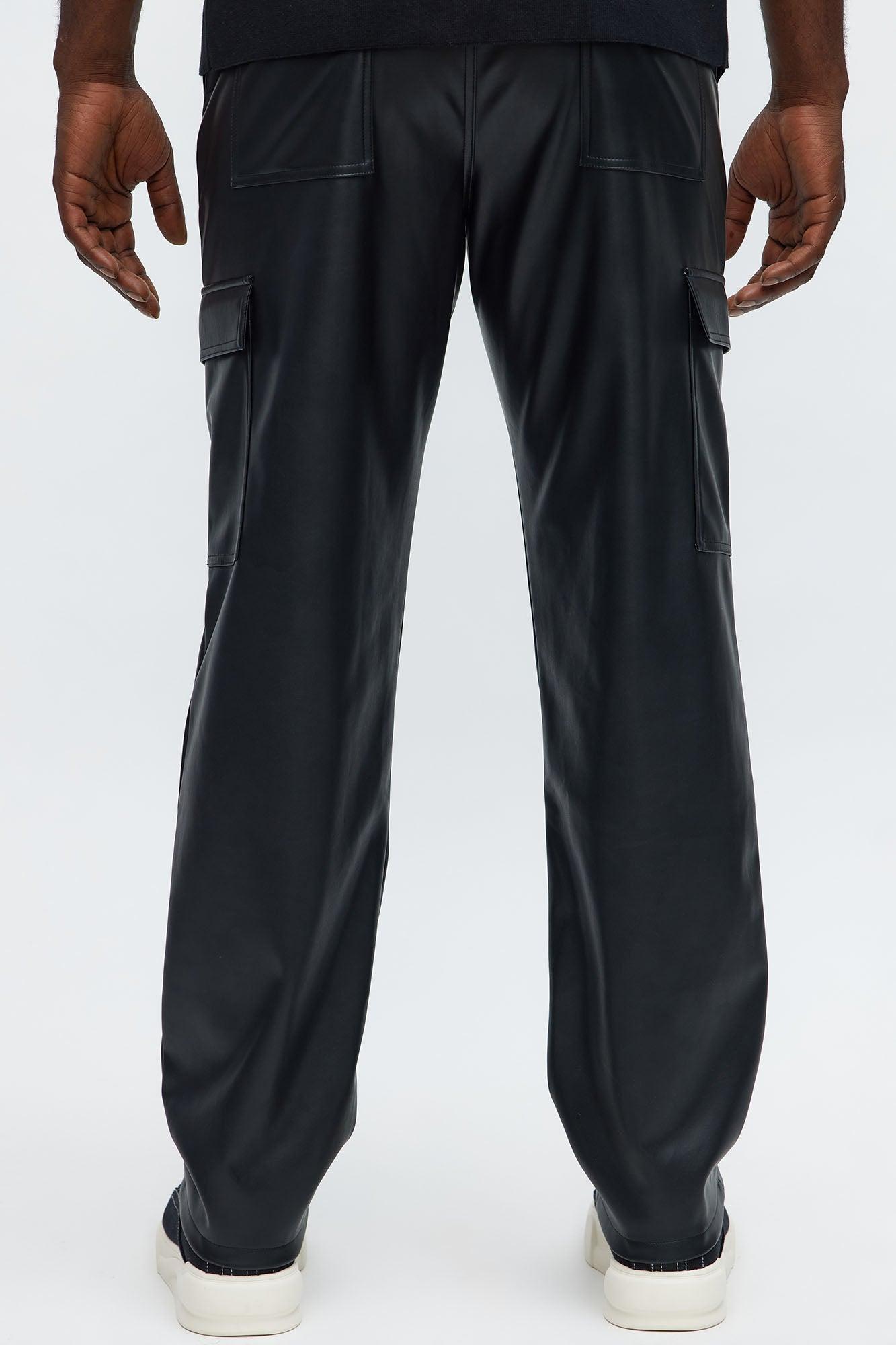 Available In Black. Stacked Slim Flared Fit Zip Fly Button Closure Back Pockets Side Pockets Cargo Pockets Pair With "Royce Faux Leather Pullover Jacket" Shell/Coating: 100% Polyurethane Base Fabric: 100% Polyester Imported California Proposition 65WARNING: Cancer and Reproductive Harm - www.P65Warnings.ca.gov.