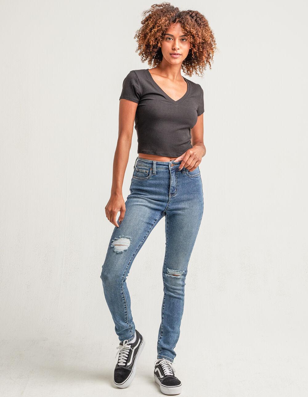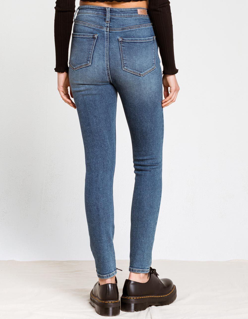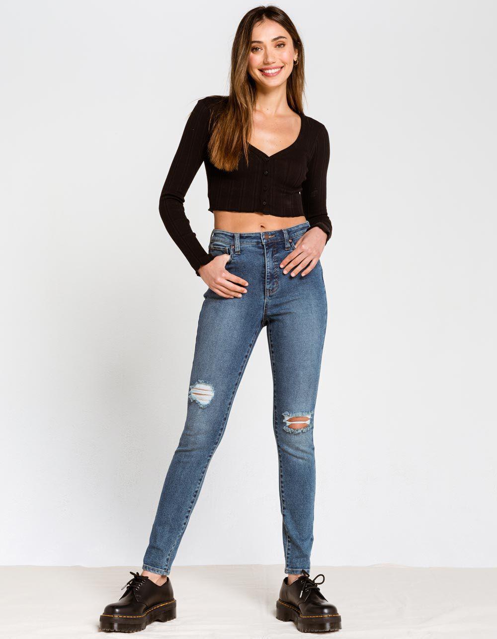 MEDIUM WASH. NOT ELIGIBLE FOR EXTRA DISCOUNT OR COUPON CODE. RSQ Curvy High Rise Skinny Jeans. Stretchy denim skinny jeans. 5-pocket styling. Fitted throughout. High rise waist. Distressed details at front. Logo patch at back right waist. Button waist and zip fly.