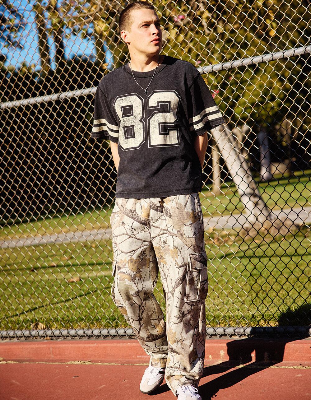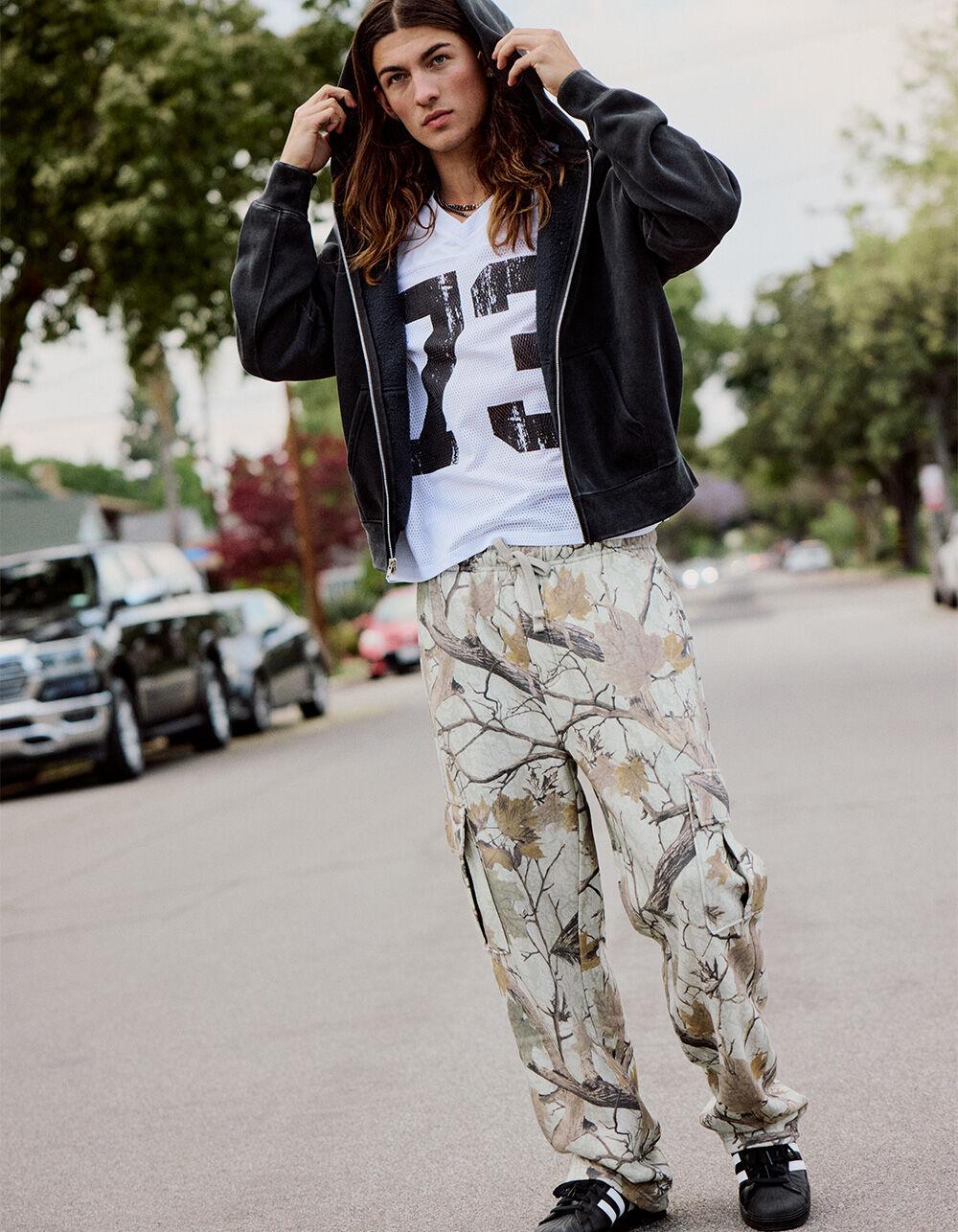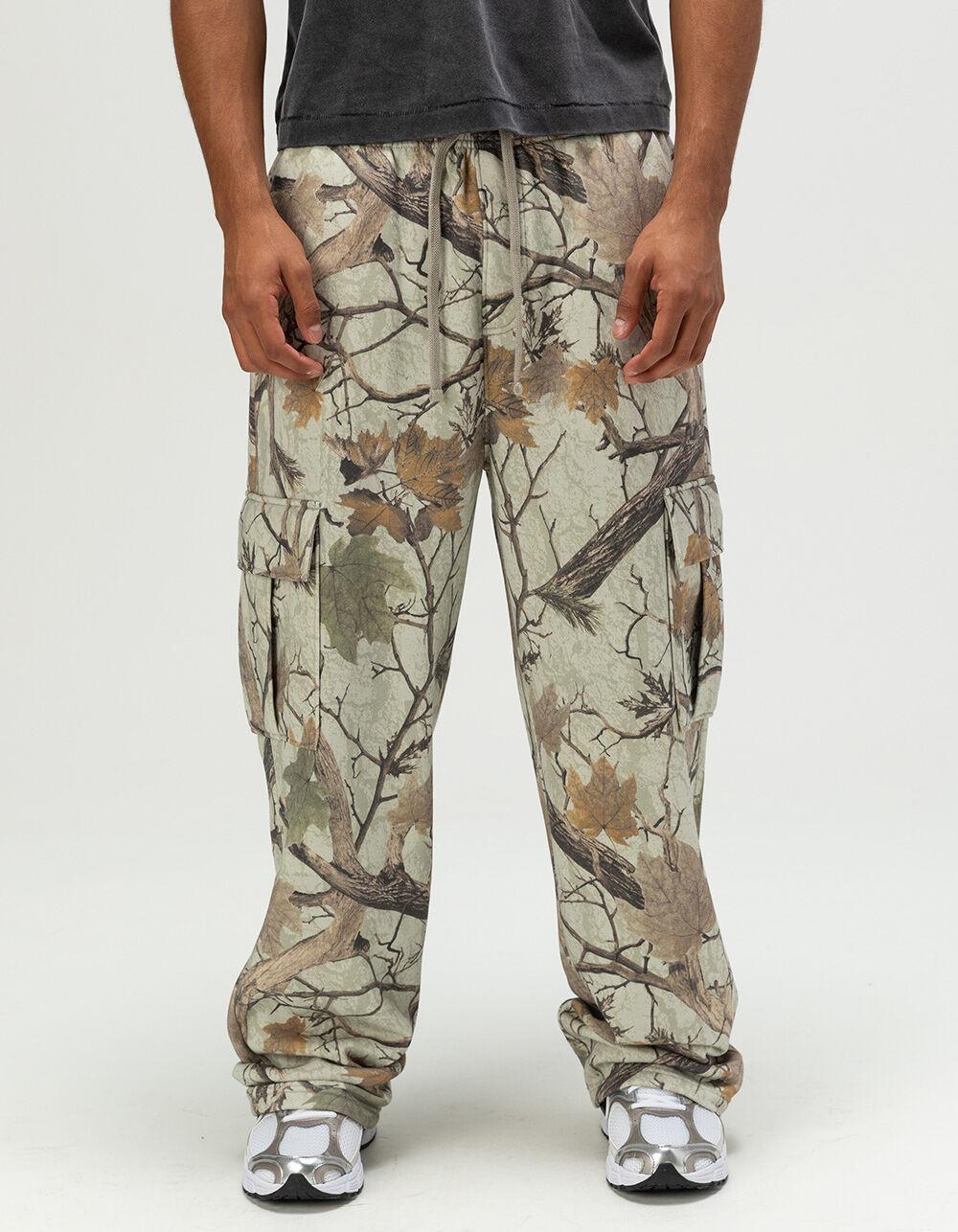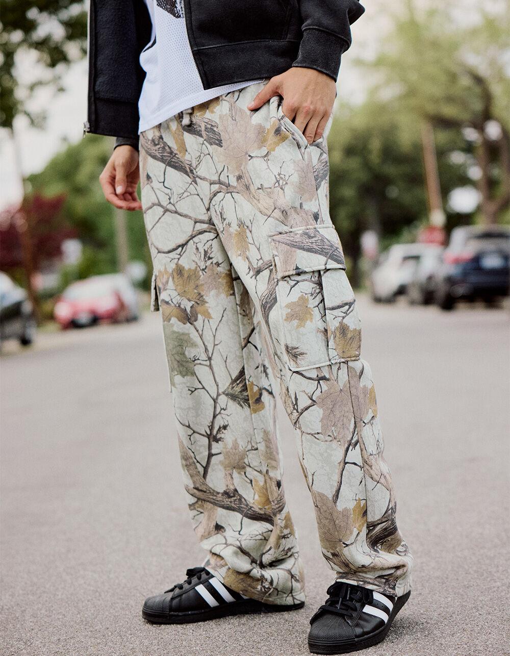 RSQ Baggy Cargo Sweatpants. Elastic waistband with drawstring. Side seam pockets. Cargo pockets with flap closures on each leg. Back right pocket. Woven label on back pocket. Baggy fit. Fleece lining. 60% Cotton 40% Polyester. Machine wash. Imported.