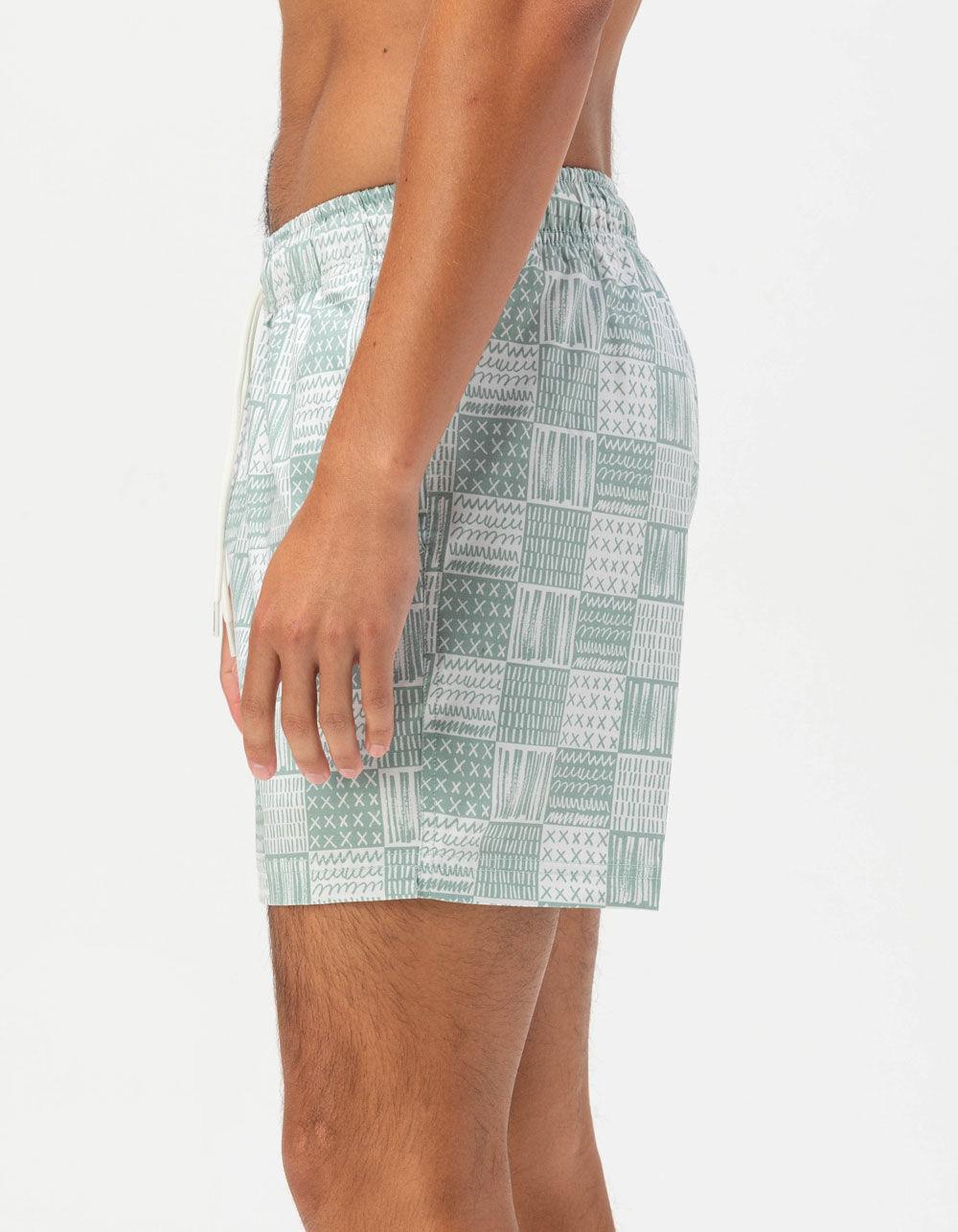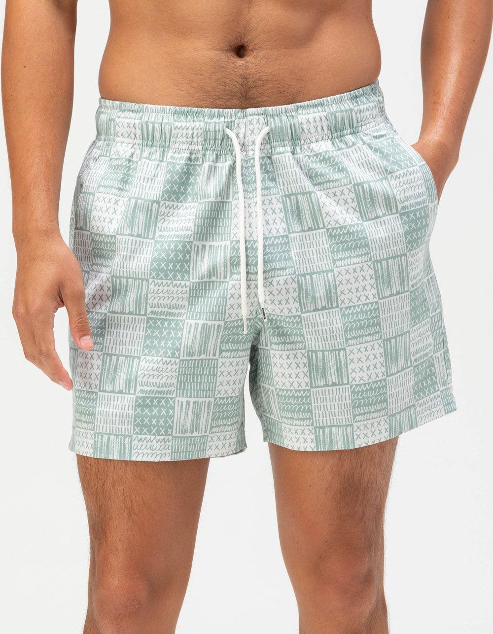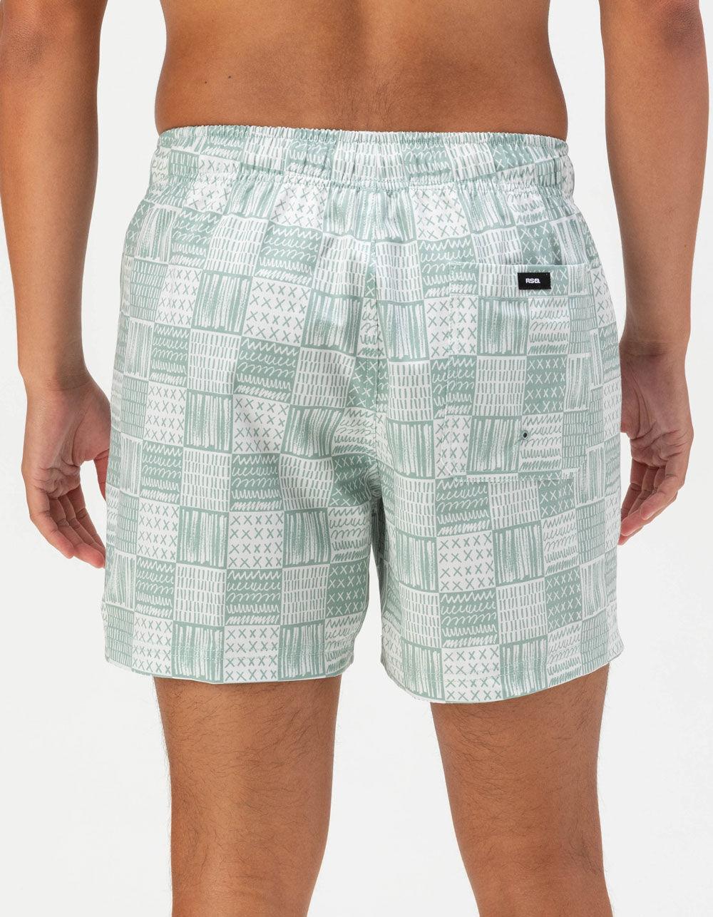RSQ Drawn Checker Swim Shorts. Allover print. Elastic waistband with drawstring. Slant pockets. Back right pocket with hook-and-loop closure. Woven RSQ label at back pocket. Approximate outseam: 16". Approximate inseam: 5". 72% Polyester 20% Cotton 8% Spandex. Machine wash. Imported.