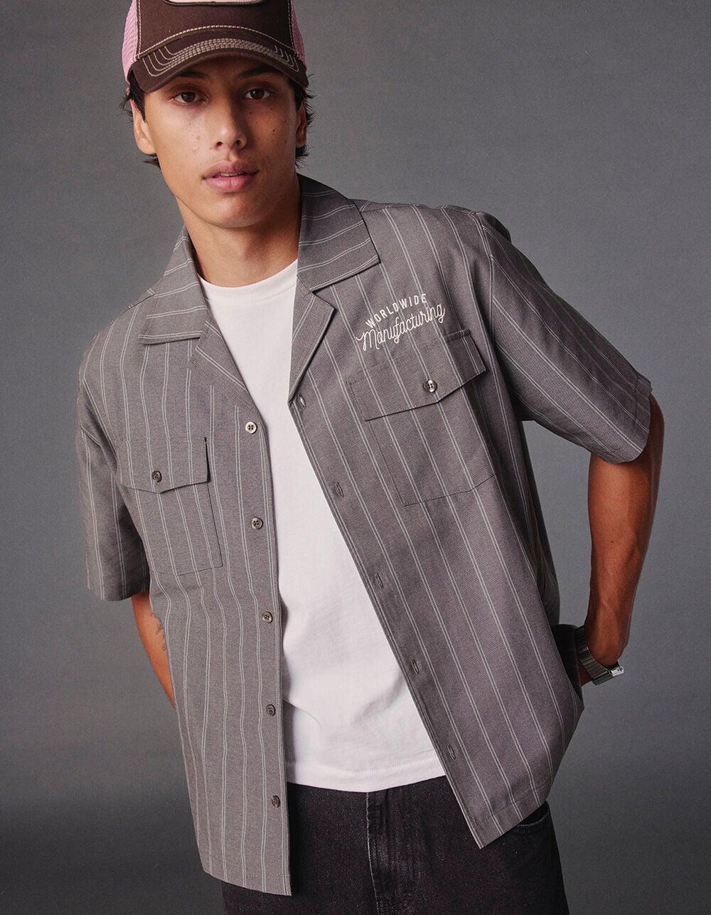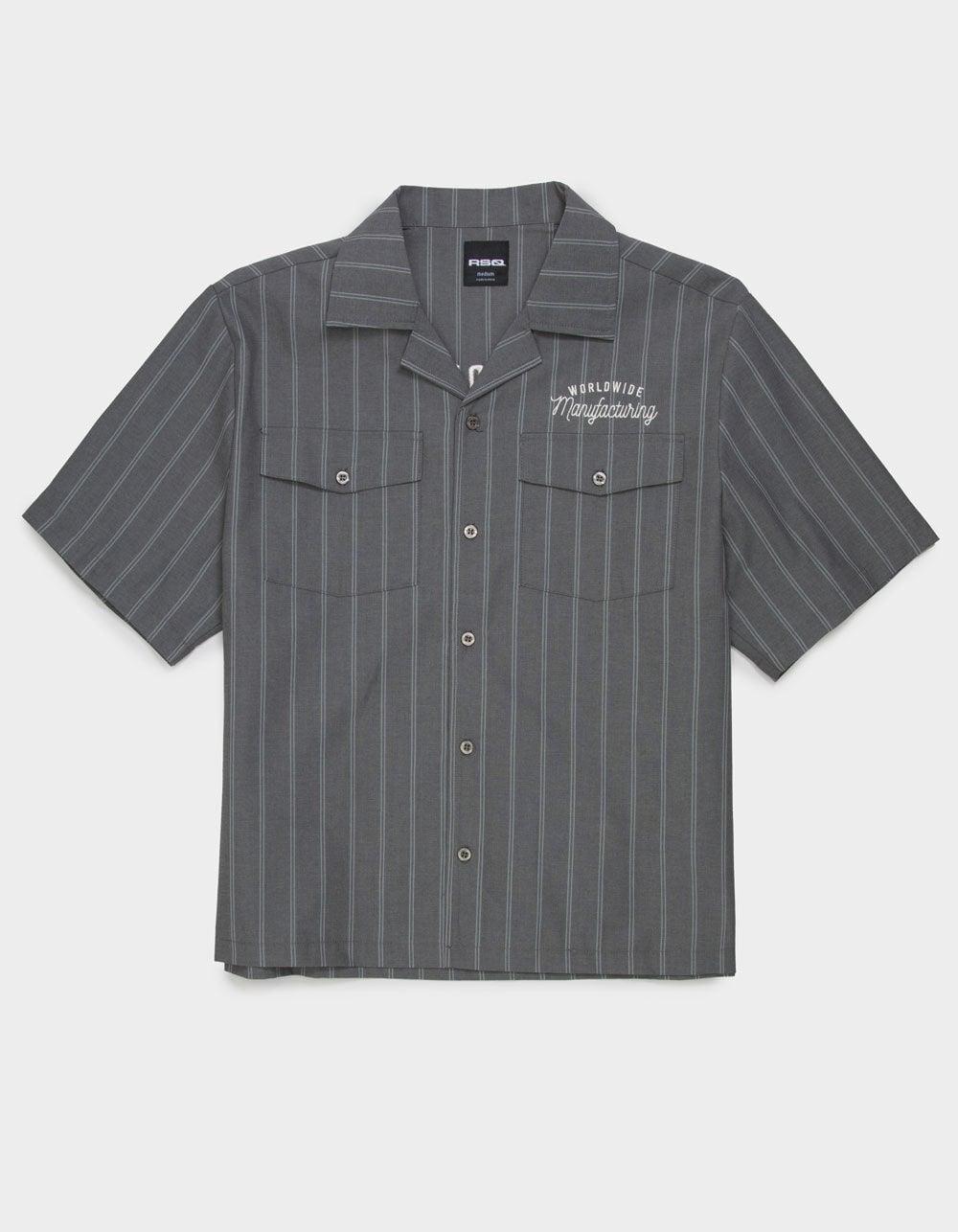 RSQ Embroidered Stripe Button Up Shirt. Allover stripe pattern. Dual chest pockets with button flap closures. Embroidery over left chest pocket. Embroidery on back. Button front. Camp collar. Short sleeve. 65% Polyester 35% Cotton. Machine wash. Imported.