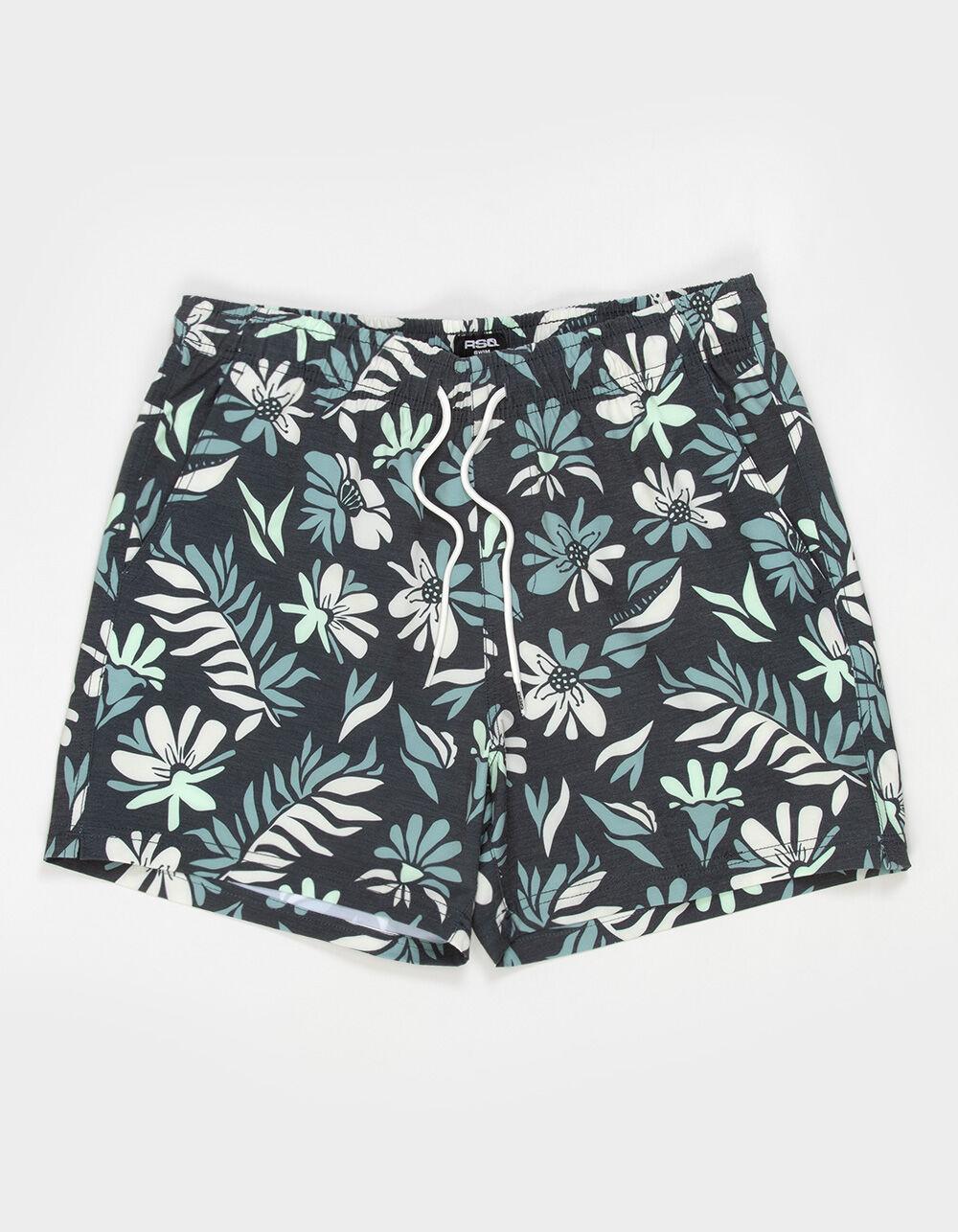 RSQ Floral Leaves 5" Swim Shorts. Allover floral leaves pattern. Elastic waistband with drawstring. Slant pockets. Back right pocket with hook-and-loop closure and woven RSQ label. Mesh pocket bags. Approximate inseam: 5". 72% Polyester 20% Cotton 8% Spandex. Machine wash. Imported.