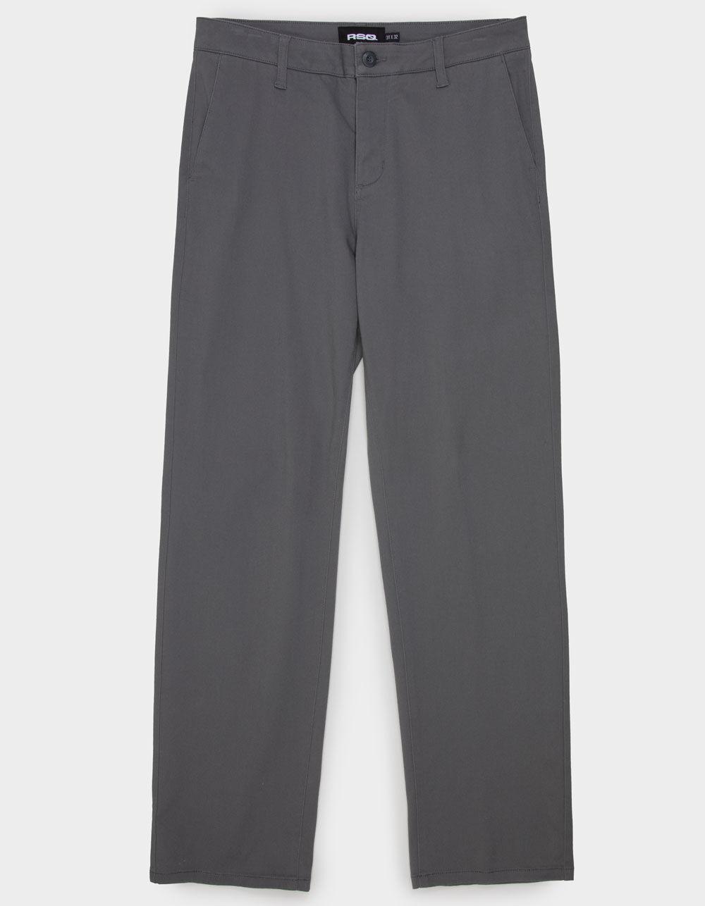 RSQ Slim Straight Chino Pants. Twill chino with stretch. Flat front. Side slip pockets. Back welt pockets with RSQ logo on left pocket opening. Button waist with zip fly. Approximate leg opening: 16". 97% Cotton 3% Spandex. Machine wash. Imported.