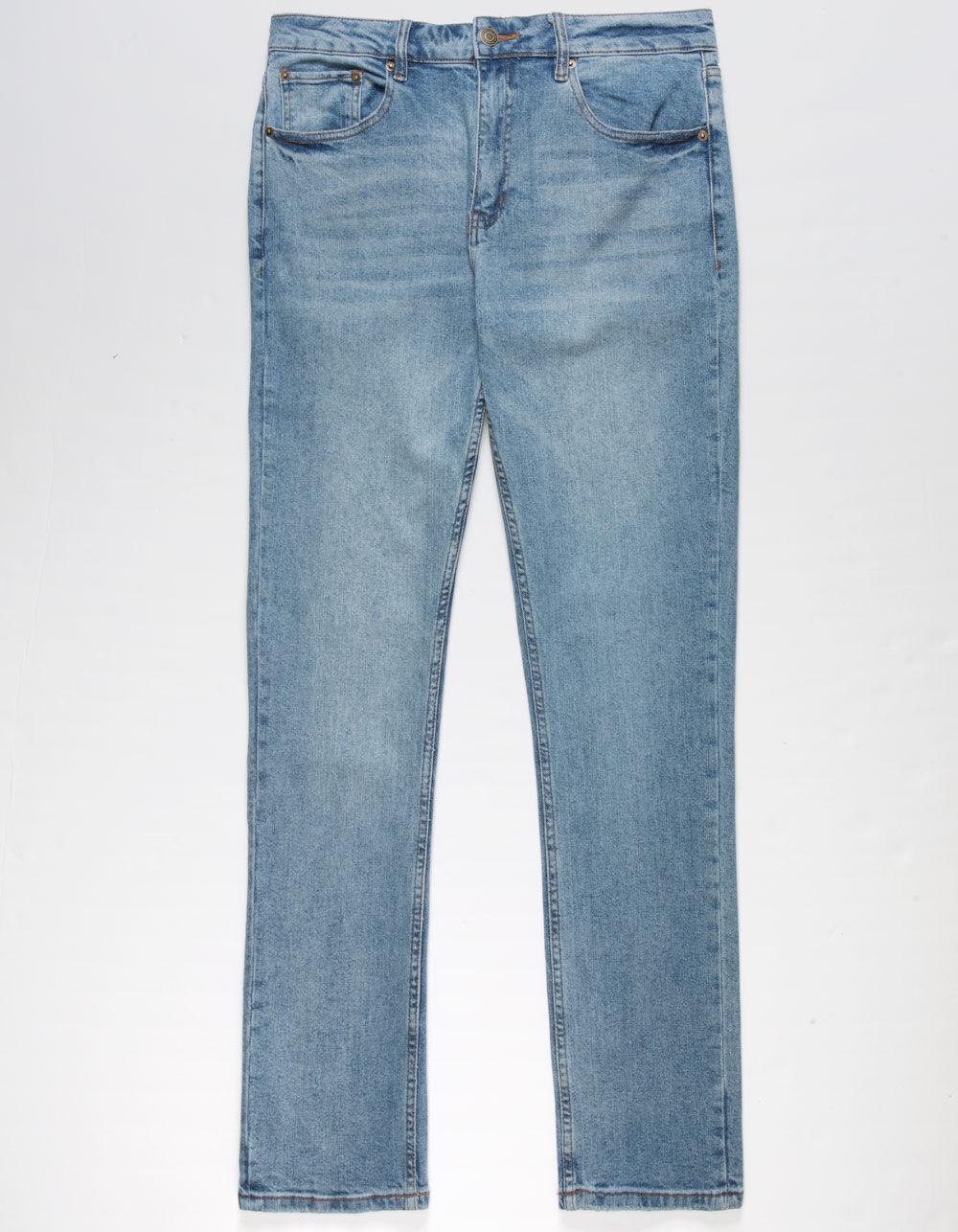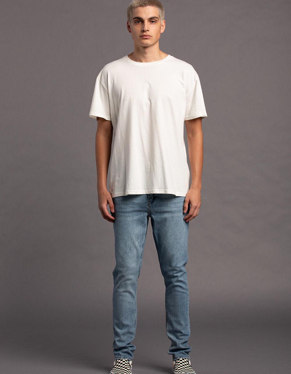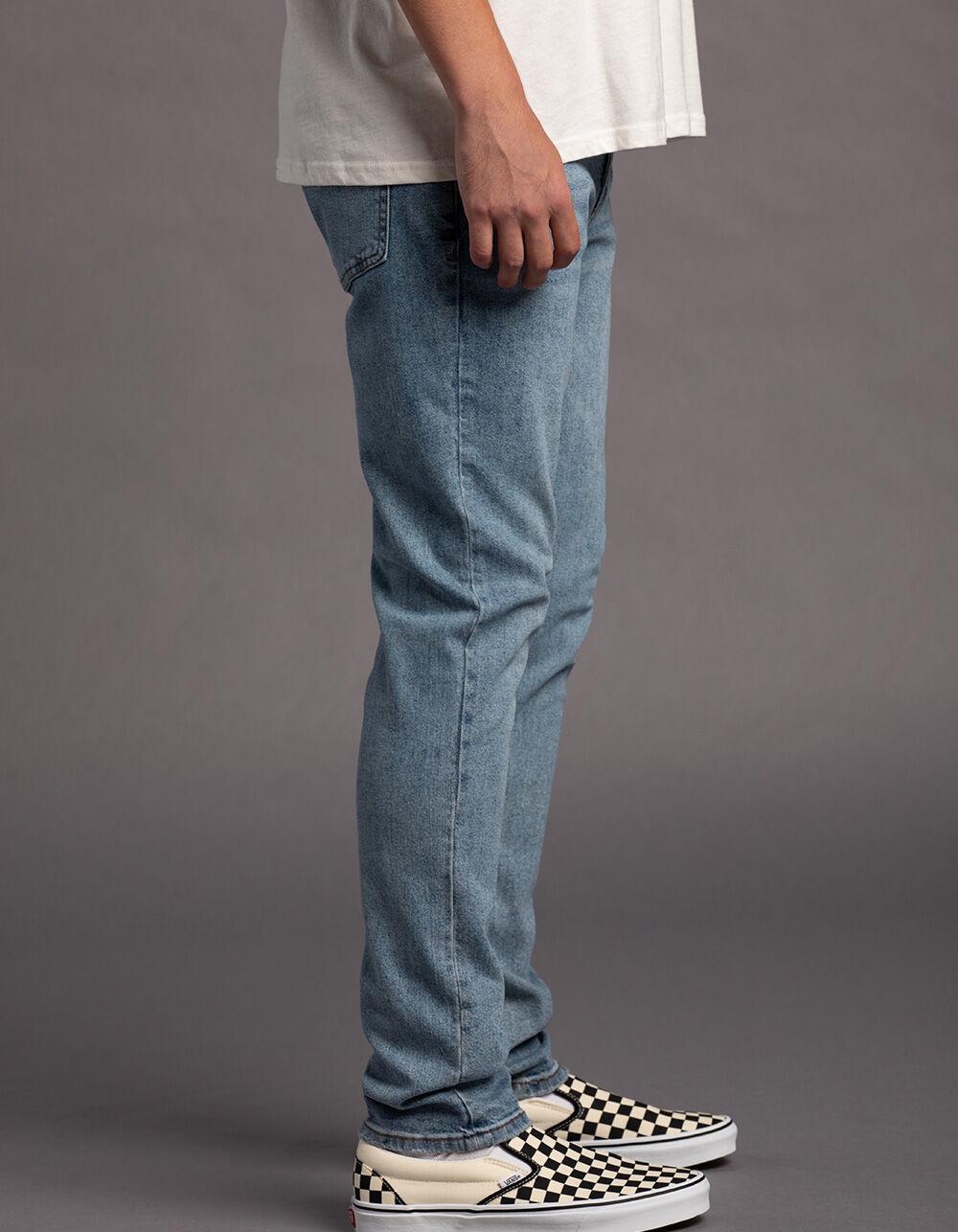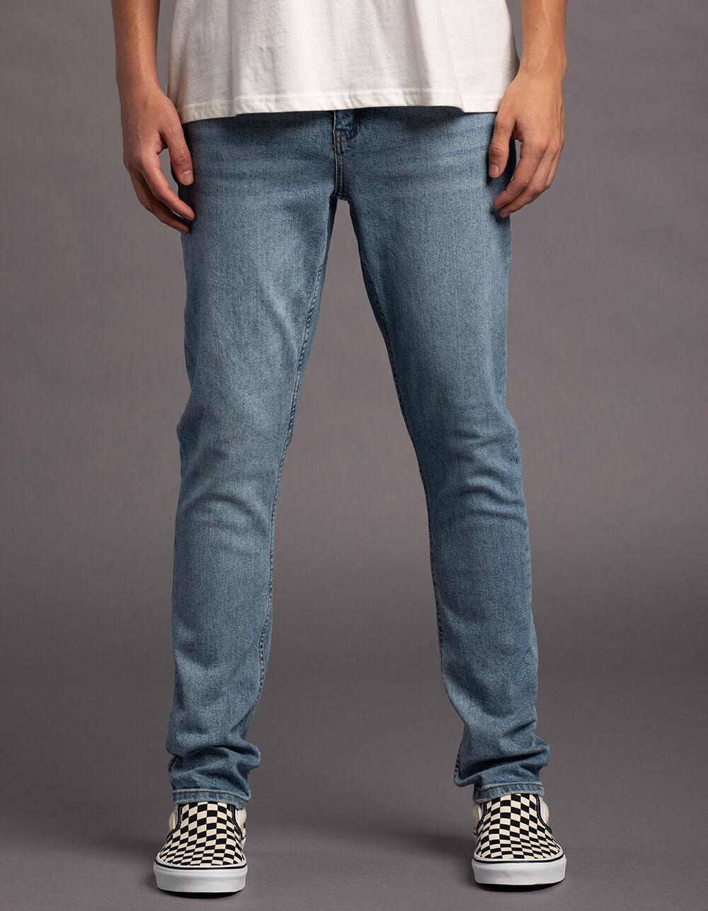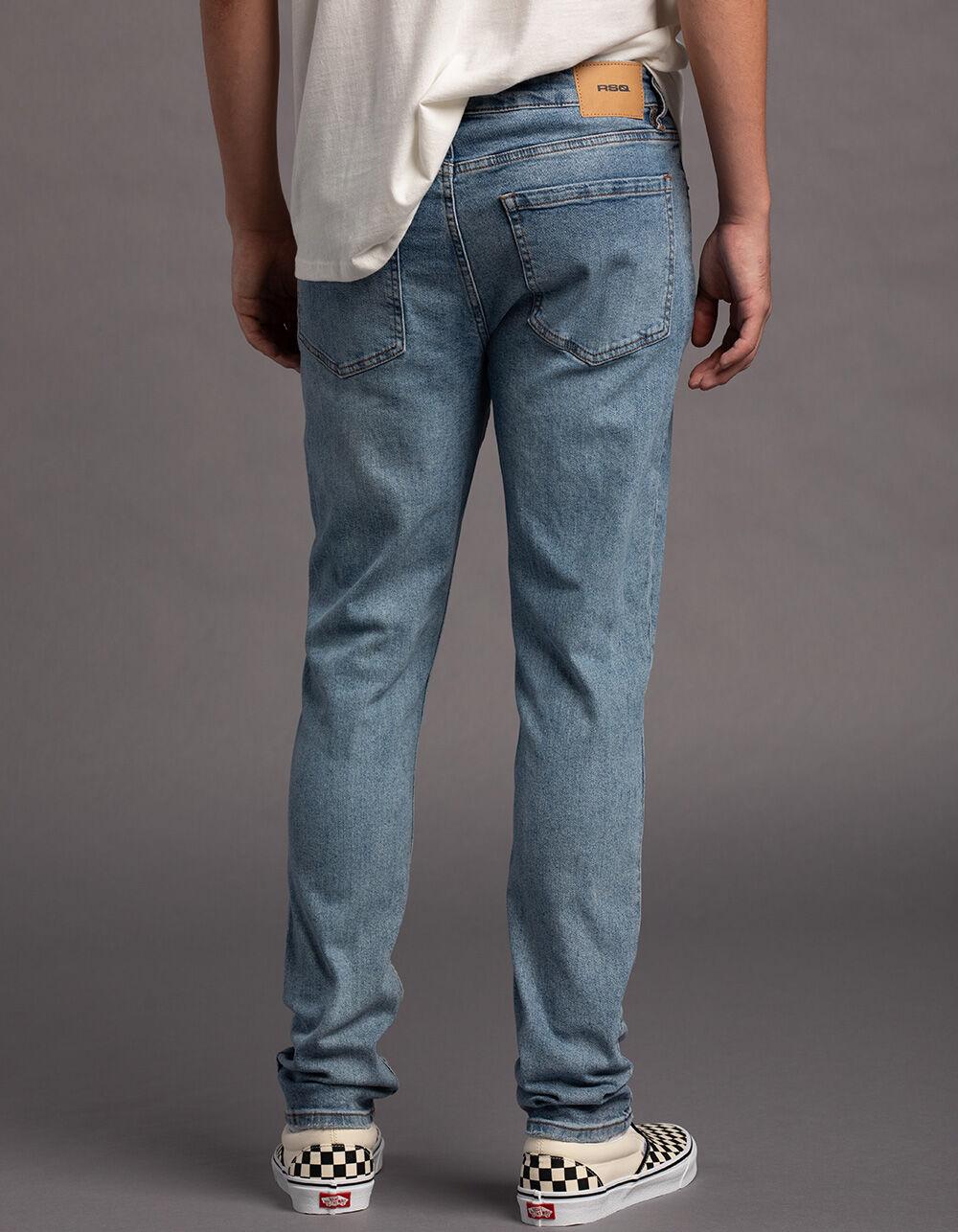 RSQ Slim Taper Medium Wash Denim Jeans. Slimmer fit through hip, thigh, and leg. Tapered leg. Button waist with zip fly. Belt loop waist. Traditional five pocket styling. Medium wash. Approx. leg opening: 14''. 99% Cotton, 1% Spandex. Machine wash. Imported.