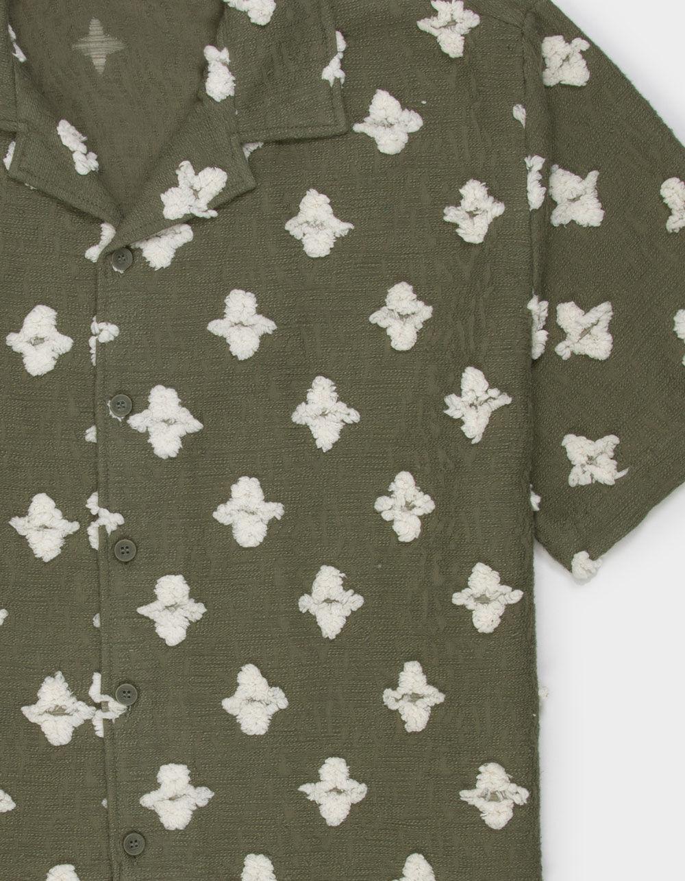 RSQ Textured Camp Shirt. Textured fabric with allover textured details. Button front. Camp collar. Short sleeve. Splits at side seams for freedom of movement. 93.2% Cotton 6.8% Polyester. Machine wash. Imported.