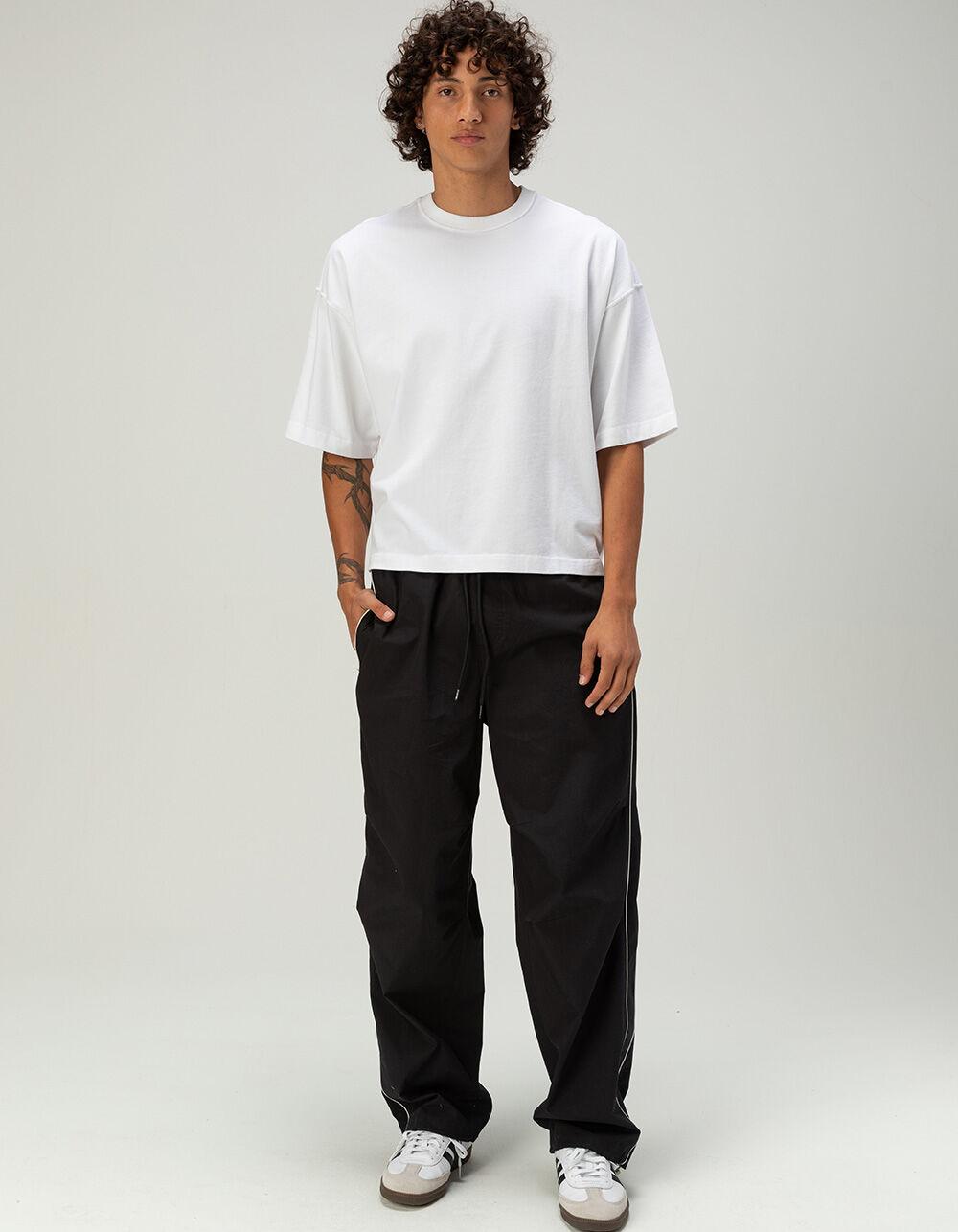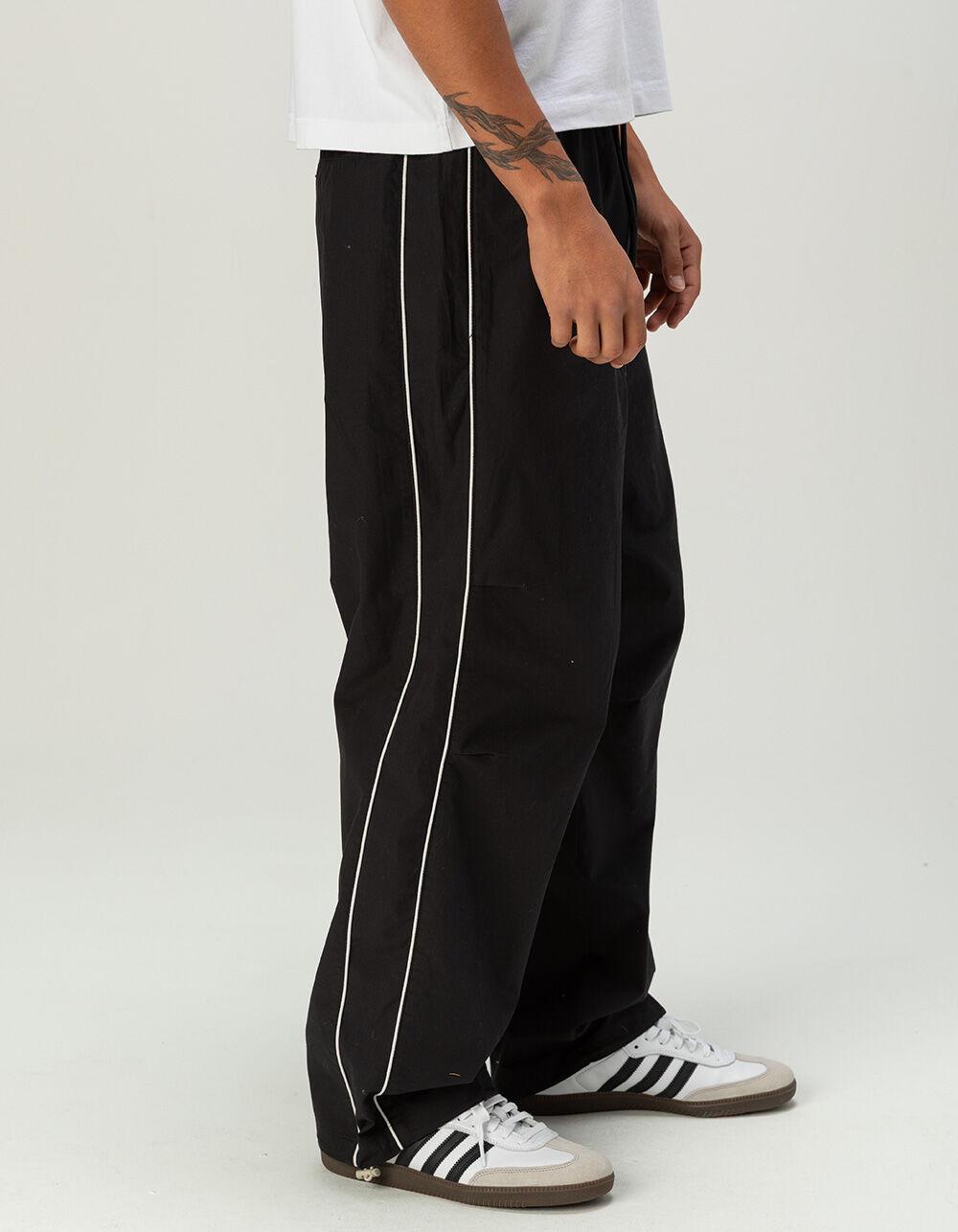 RSQ Track Pants. These solid color RSQ track pants feature stripe details at the side seams, an elastic waistband and adjustable elastic toggles at the leg openings for a customizable fit. Side seam pockets. Dual back pockets. Approximate leg openings: 18". Approximate inseam: 29". 100% Cotton. Machine wash. Imported.