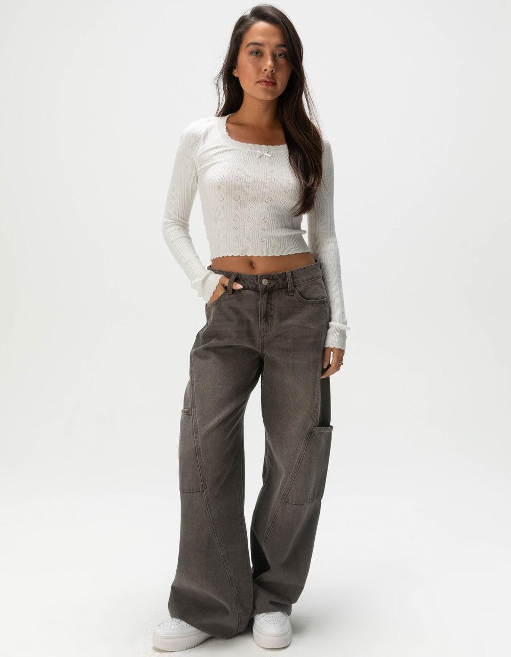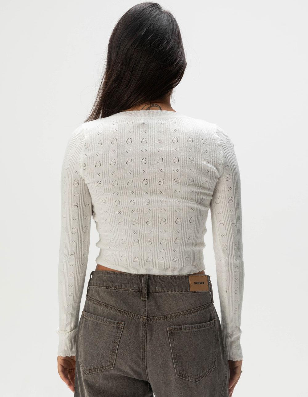 CREAM. RSQ Pointelle Scallop Pullover Sweater. This pointelle scallop pullover sweater features delicate pointelle knit detailing and a charming scalloped hem, adding a feminine touch to your wardrobe. Scoop neckline with small bow detailing. Long sleeves. 52% Viscose, 29% Polyester, 19% Nylon, Hand wash. Imported.