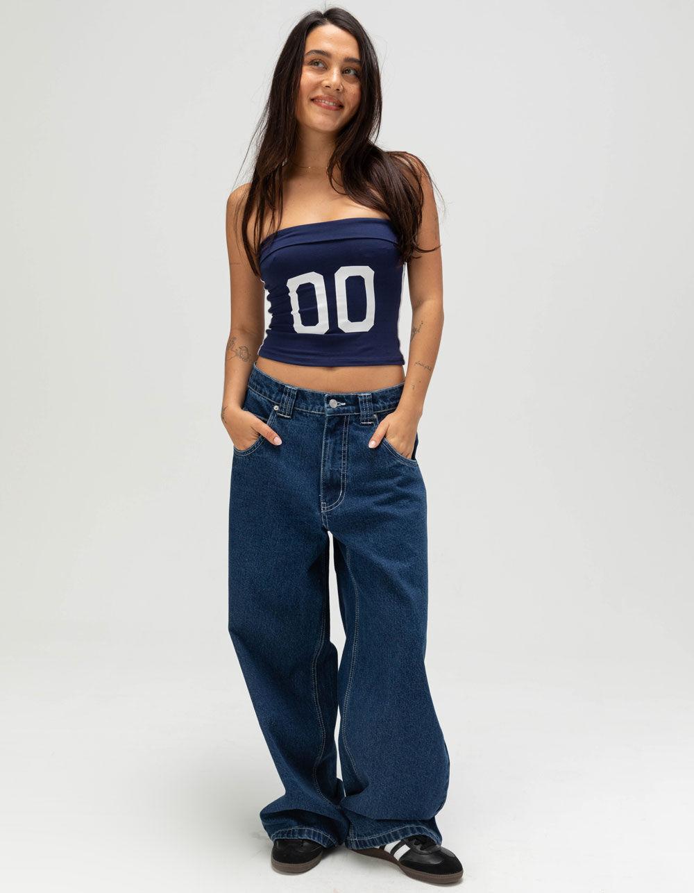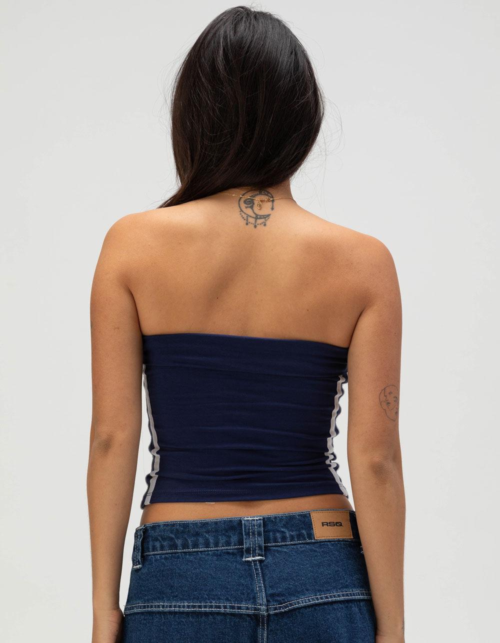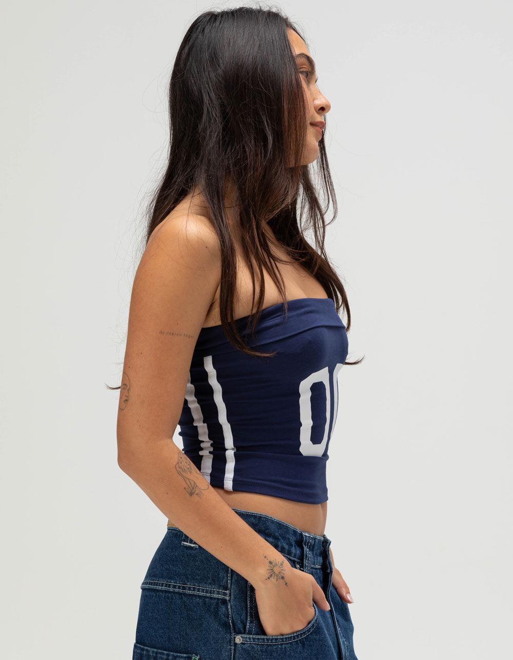 NAVY. RSQ 00 Tube Top. 00 screened on front. Stripe details sewn on sides. Fold-over detail at top. Cropped length. Sleeveless design. 95% Cotton 5% Elastane. Machine wash. Imported.