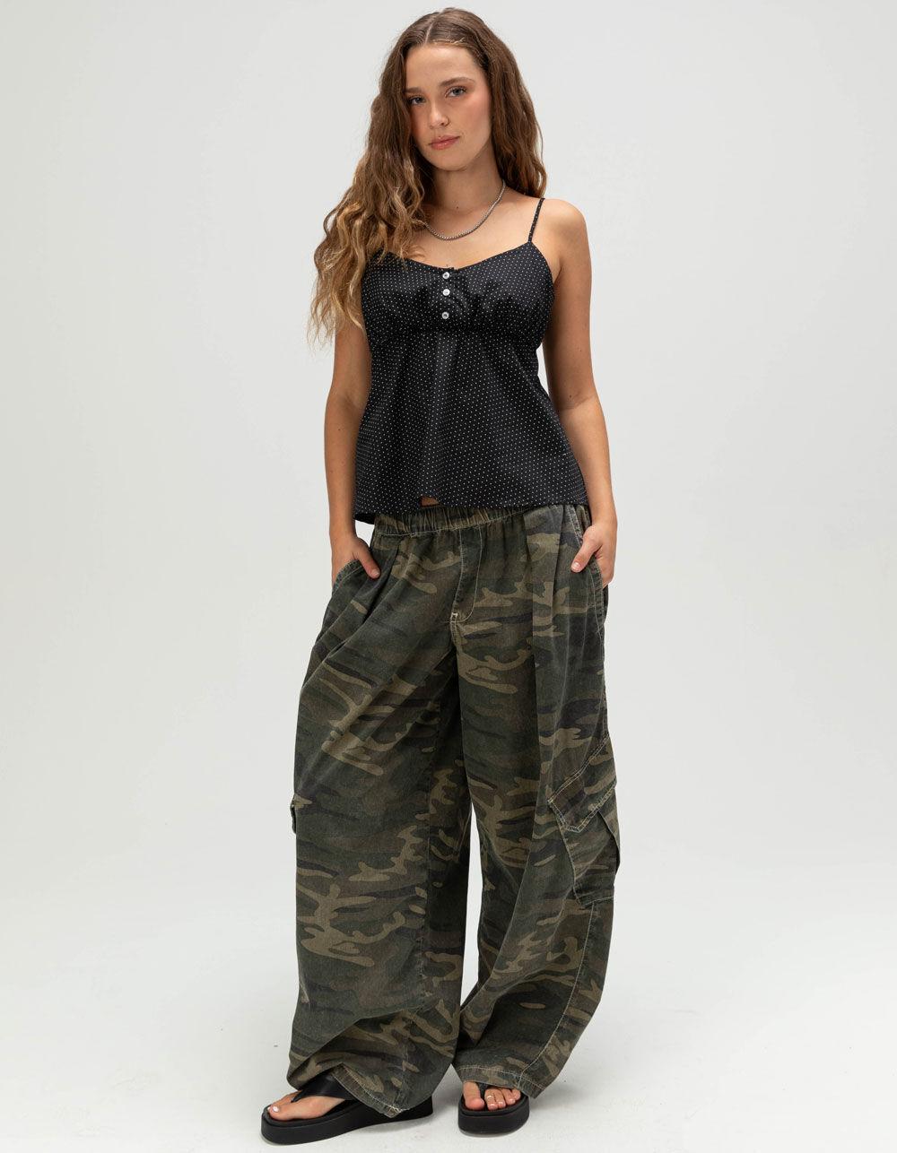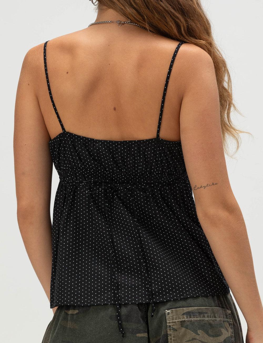 The RSQ Babydoll Cami is a playful and feminine addition to any warm-weather wardrobe. Featuring an allover polka dot pattern, this sleeveless top is designed with delicate thin straps and a gathered chest for a soft, flattering silhouette. A three-button closure at the front adds a touch of charm, while the elasticized back with a tie detail ensures a comfortable and adjustable fit. The lined chest offers added coverage, making it easy to wear on its own or layered under a light jacket. Pair it with your favorite denim or a flowy skirt for an effortlessly cute look. 98% Cotton 2% Spandex. Machine wash. Imported.