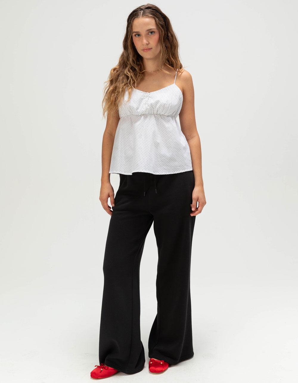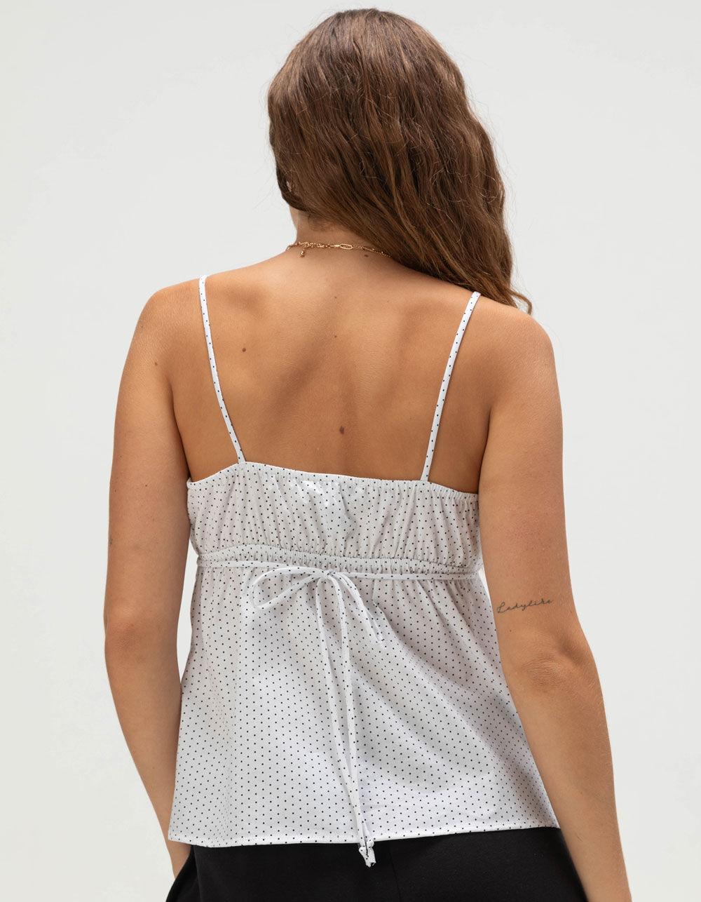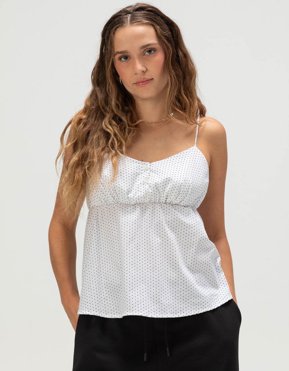 The RSQ Babydoll Cami is a playful and feminine addition to any warm-weather wardrobe. Featuring an allover polka dot pattern, this sleeveless top is designed with delicate thin straps and a gathered chest for a soft, flattering silhouette. A three-button closure at the front adds a touch of charm, while the elasticized back with a tie detail ensures a comfortable and adjustable fit. The lined chest offers added coverage, making it easy to wear on its own or layered under a light jacket. Pair it with your favorite denim or a flowy skirt for an effortlessly cute look. 98% Cotton 2% Spandex. Machine wash. Imported.