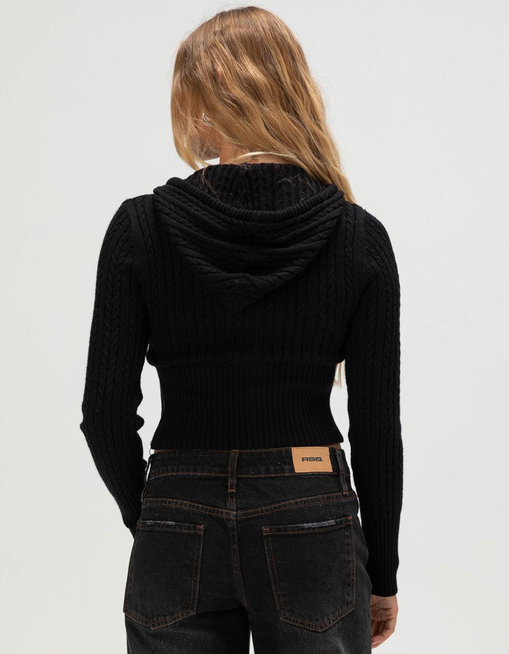BLACK. RSQ Cable Knit Zip-Up Sweater. Stay cozy and stylish with the RSQ Cable Knit Zip-Up Sweater for women, a perfect blend of comfort and timeless design. Featuring a classic cable knit pattern in a versatile solid color, this sweater adds texture and warmth to any outfit. The full zip-up front allows for easy layering, while the drawstring hood offers extra coverage on chilly days. Finished with a ribbed hem for a snug fit, this sweater is a go-to piece for laid-back days, whether you're out and about or relaxing at home. 50% Rayon 28% Polyester 22% Nylon. Hand wash. Imported.