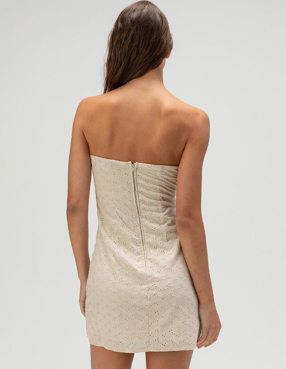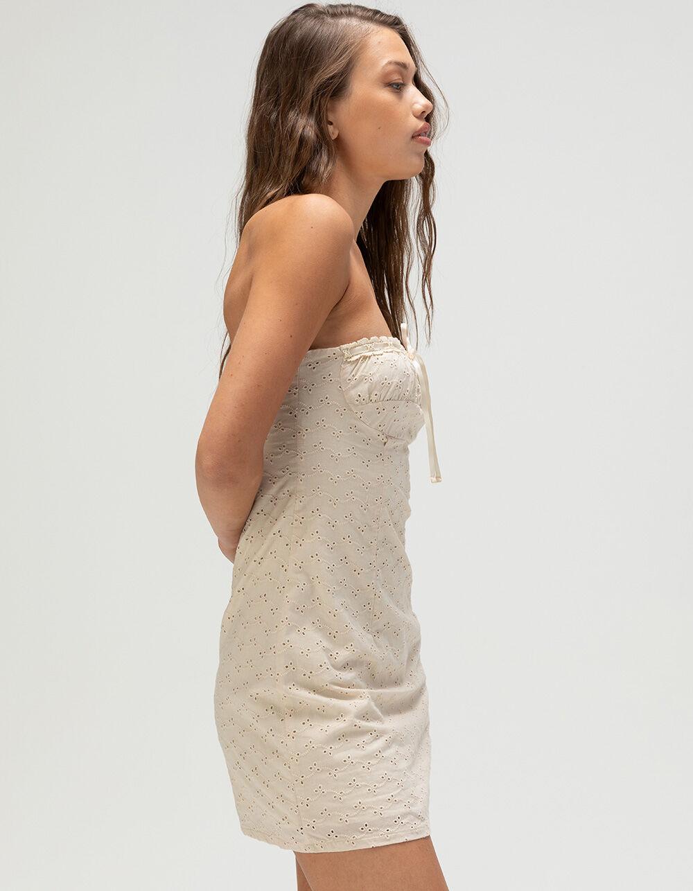 BEIGE. RSQ Eyelet Tube Dress. Sweet and feminine, the RSQ Eyelet Tube Dress for women is a charming warm-weather essential. This sleeveless tube dress features allover floral eyelet detailing for a delicate, textured look, while the gathered chest adds a touch of softness and shape. A lace trim with a satin bow at the center front enhances the romantic vibe, making it perfect for sunny days or special outings. Fully lined for comfort and coverage, it’s finished with a 3/4 zip back closure for easy wear. With an approximate 24" length, this dress delivers a flattering, flirty silhouette that’s both playful and pretty. 100% Cotton. Machine wash. Imported.