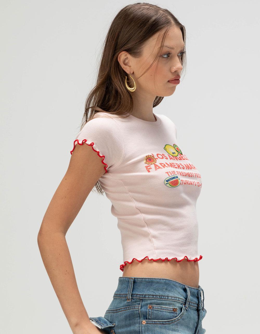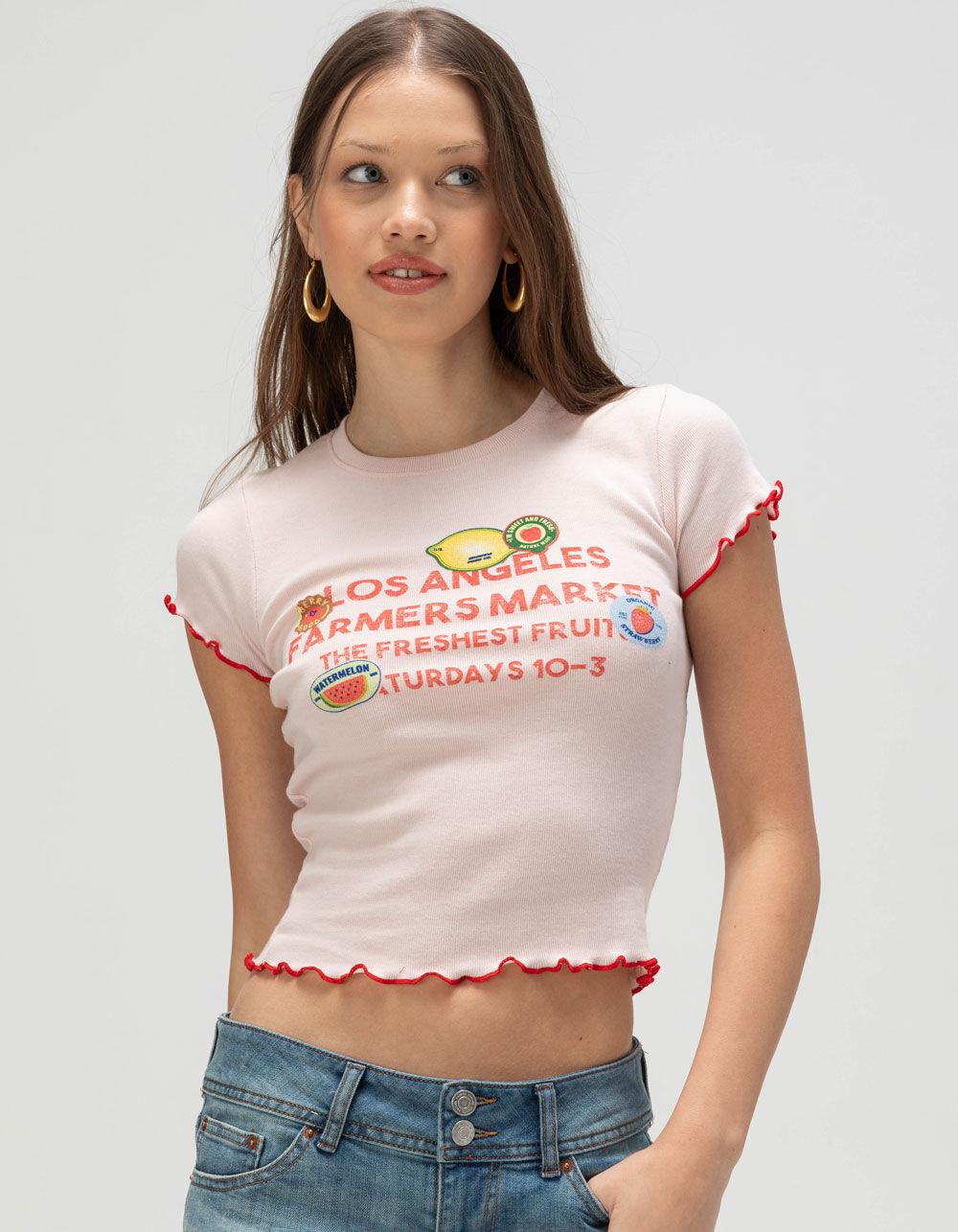 PINK. RSQ Farmers Market Baby Tee. Rib knit construction. Distressed graphic screened on front. Lettuce edge trim. Baby tee silhouette. Crew neck. Short sleeve. 50% Cotton 50% Polyester. Machine wash. Imported.