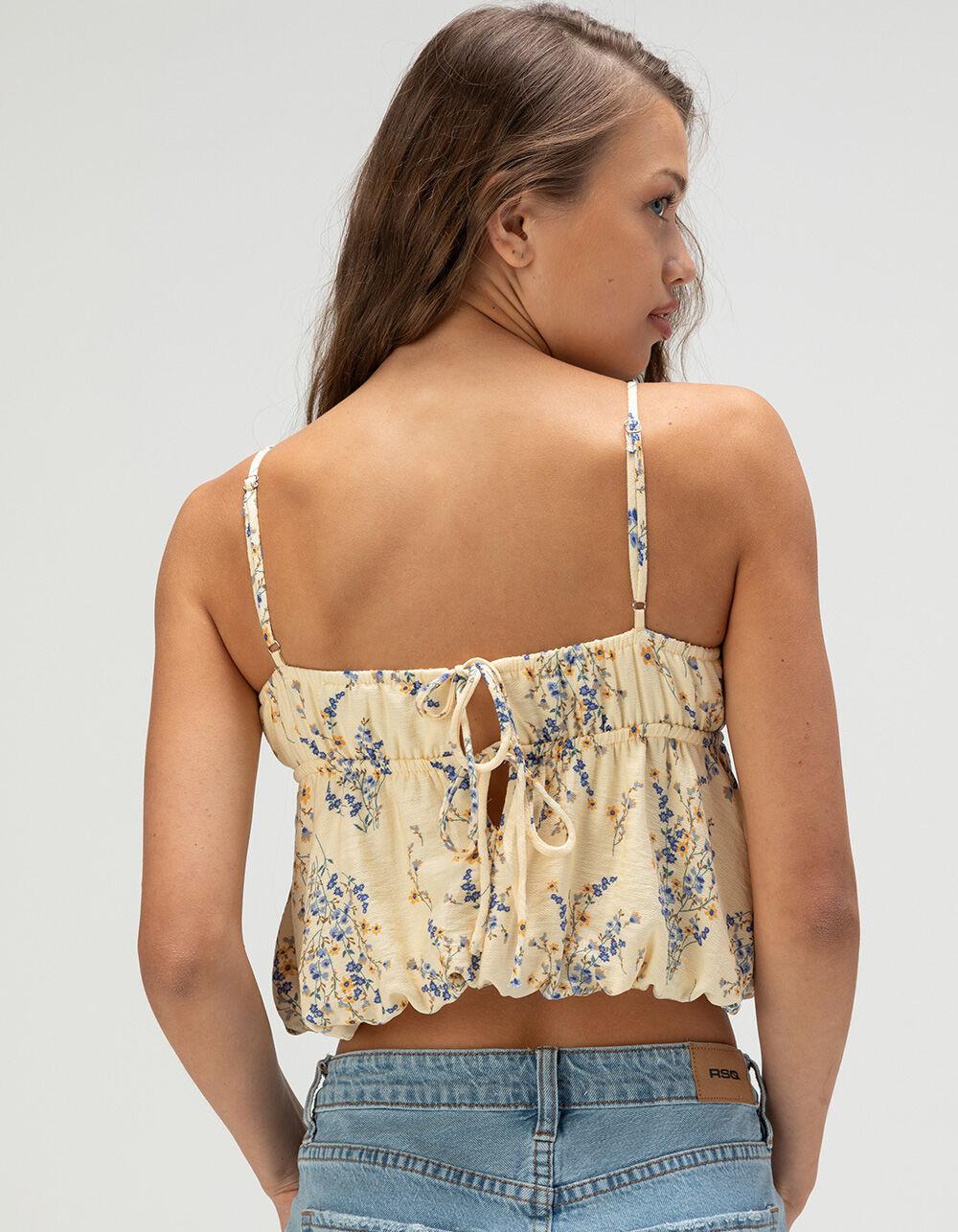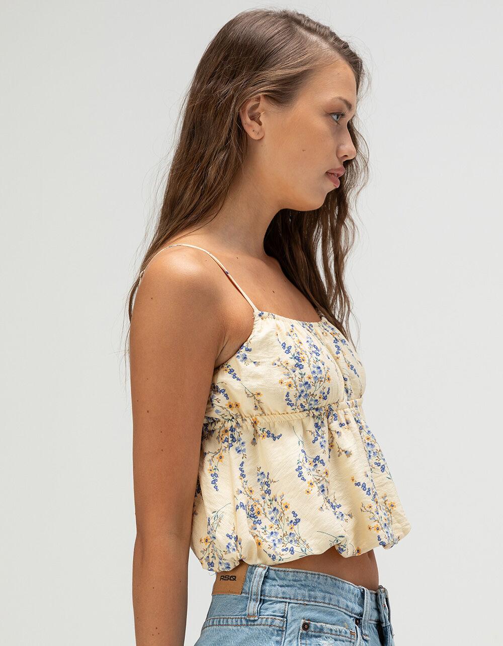 RSQ Floral Bubble Babydoll Top. The RSQ Floral Bubble Babydoll Top is the perfect blend of feminine charm and effortless style. Featuring an allover floral print, this sleeveless top boasts a flattering bubble hem that adds volume and movement to your look. The adjustable straps ensure a customizable fit, while the opening at the chest with two tie closures adds a playful, trendy detail. Fully lined for comfort, this top is ideal for pairing with your favorite jeans or skirts for a relaxed yet stylish vibe. 80% Rayon 20% Nylon. Hand wash. Imported.