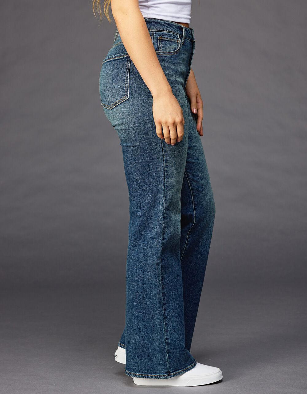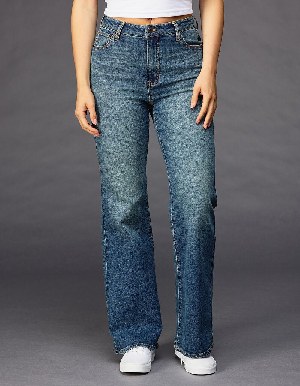 RSQ High Rise Flare Jeans. Belt loop waist. Button closure paired with zipper fly. Traditional 5 pocket design. High rise. Fitted through hip and thigh. Flared leg. Medium wash. Approx. inseam: 30.5". 69% Cotton, 30% Recycled Cotton, 1% Spandex. Machine wash. Imported.