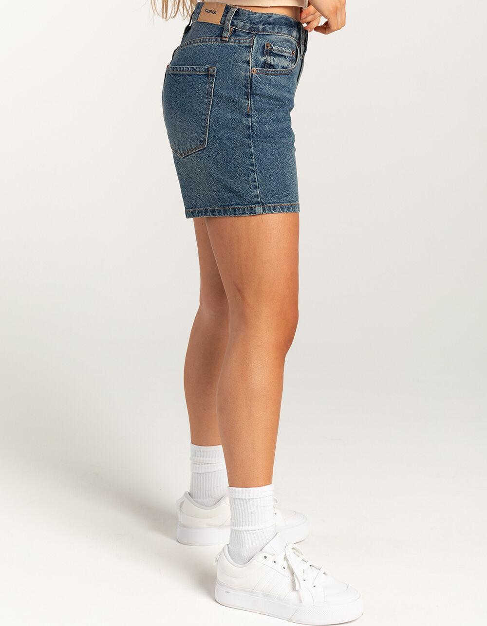 Dark Wash. RSQ High Rise Midi Shorts. Crafted from premium denim fabric, these shorts offer durability and a timeless look. High-rise waistline and midi length. Zip fly and button closure. Belt loop waist. Traditional five pocket styling. Dark wash. Approx. inseam: 5''. 97% Cotton, 2% Rayon, 1% Spandex. Machine wash. Imported.