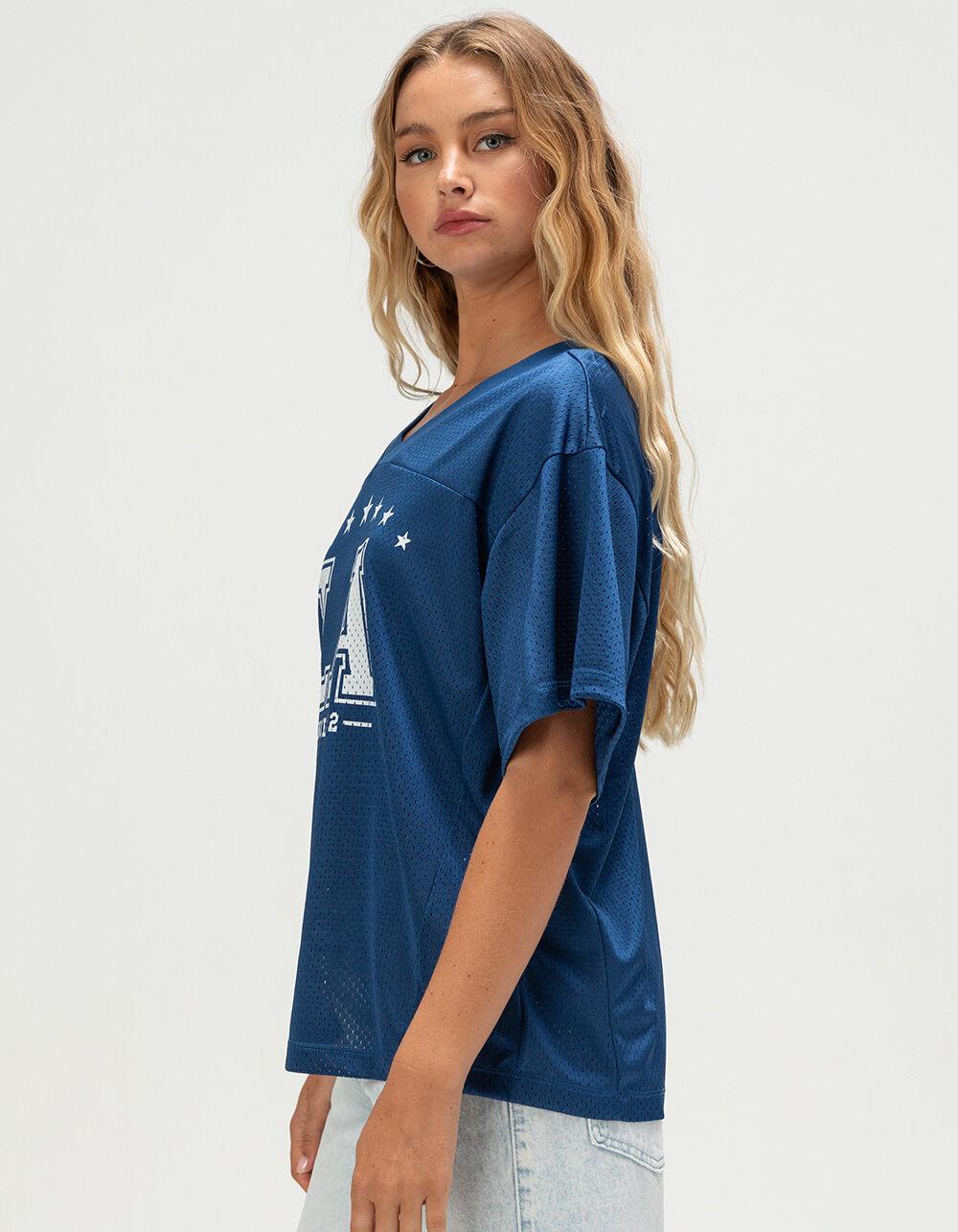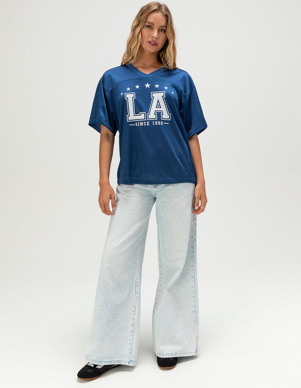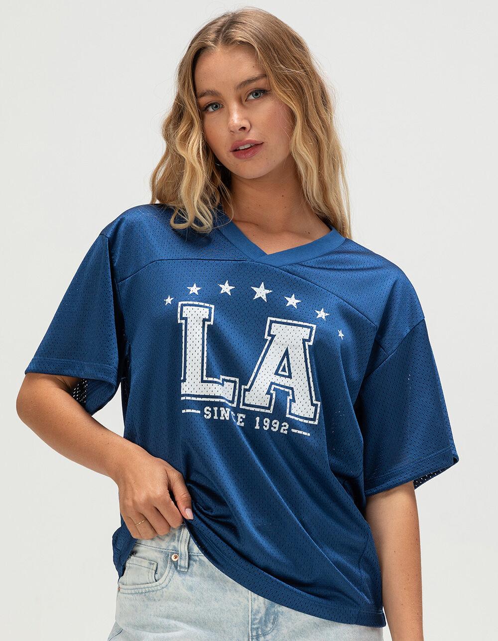 NAVY. RSQ LA Jersey Tee. The RSQ LA Jersey Tee brings sporty style with a streetwear edge. Made from allover mesh fabric, this breathable, jersey-inspired tee features a bold “LA” graphic on the front, accented with stars and “Since 1992” for a vintage athletic vibe. Designed with a classic V-neckline and short sleeves, it blends comfort with standout style—perfect for pairing with jeans, shorts, or layered over a tank for an effortlessly cool look. 100% Polyester. Machine wash. Imported.